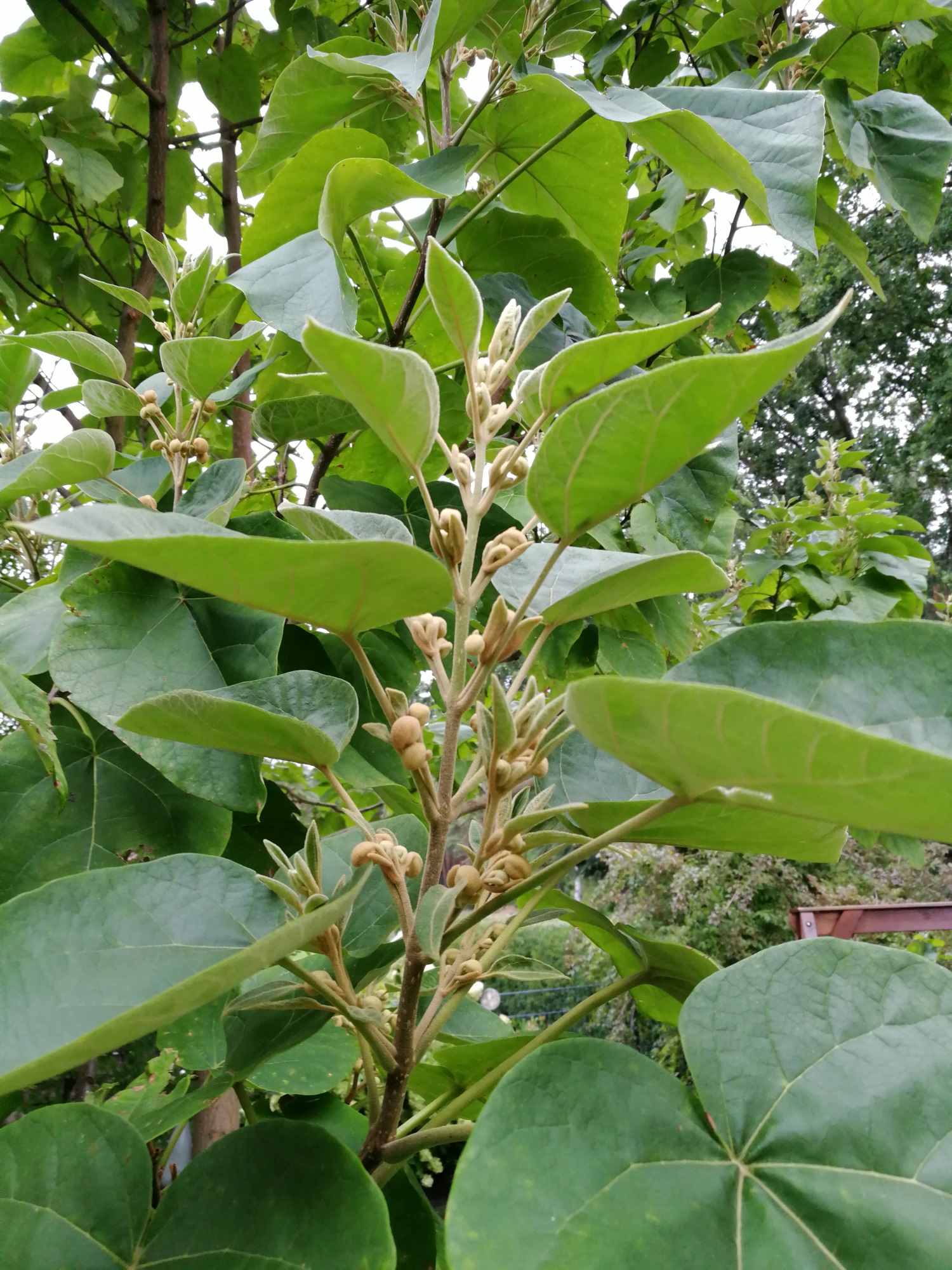 Nach sieben Jahren des Warten blüht mein Blauglockenbaum zum allerersten Mal. Der Baum ist mittlerweile ca. 5,40m hoch und vor ca. drei Jahren hat er das erste Mal im Herbst Blütenknospen gebildet die leider alle erfroren. Das gleiche Spiel gab's im 2016/17 und ich hatte befürchtet, dass es in diesem Jahr genau so sein würde. Auch war der Winter 2017/18 in Niedersachsen zumindest gefühlt länger und kälter als die Jahre zuvor. Umso größer war die Freude als ich entdeckte, dass einige Knospen im Frühjahr größer wurden. Von den geschätzten 300 Knospen sind die meisten so groß wie Erbsen. Diese haben den Winter nicht überlebt und fallen alle so langsam vom Baum. Geschätzte 20 Knospen sind so groß wie Kirschen und öffnen sich langsam. Bei meinem Baum handelt es sich um die Variation Pawlonia Fortuneii (Fast Blue). Er wird nicht besonders gepflegt und im Winter auch nicht geschützt.