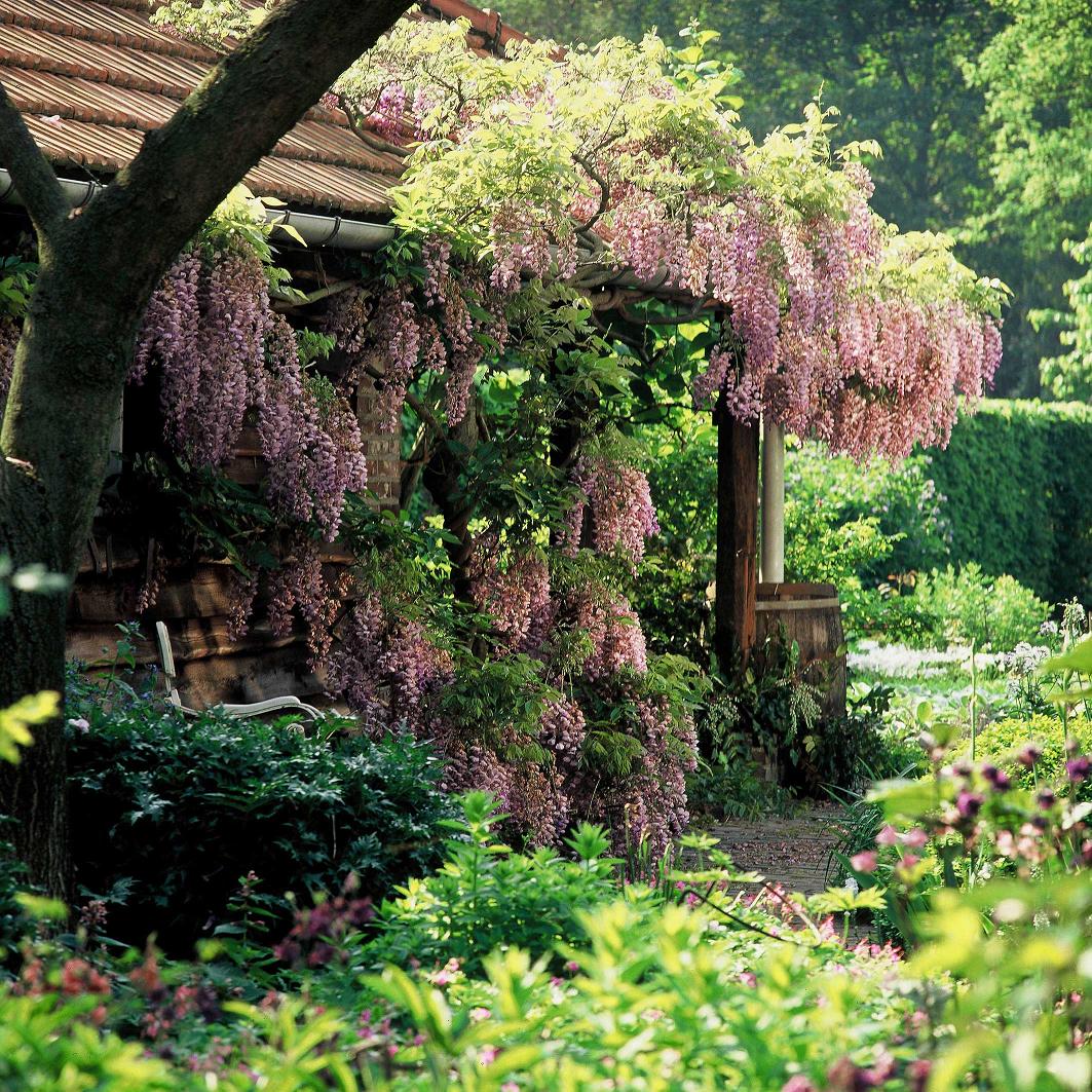Die Kletterhortensie hat lockere Blütenstände und wirkt wegen ihrer cremeweißen Blüten sehr nostalgisch. Mit ihren Haftwurzeln wächst sie aus eigener Kraft in die Höhe. Sie erklimmt sogar Bäume, denn sie verträgt auch schattige Standorte. An hohen Wänden sollte man ihr aber eventuell eine Kletterhilfe bieten. Die Kletterhortensie kann im Alter so groß werden, dass die Haftwurzeln alleine nicht ausreichen, um das Gewicht zu halten. Der Blauregen hat einen höheren Lichtbedarf. Er benötigt eine stabile Kletterhilfe, denn er besitzt keine Haftwurzeln und wächst schnell. Im Mai und Juni erscheinen eindrucksvolle, bis zu 50 cm lange Blütentrauben. Anders als der Name vermuten lässt, gibt es neben blau auch weiß, rosa oder violett blühende Arten und Sorten. Die schönen, gefiederten Blätter des Blauregens tragen dazu bei, dass der neue Lieblingsplatz im Garten auch nach der Blüte sehr einladend ist.