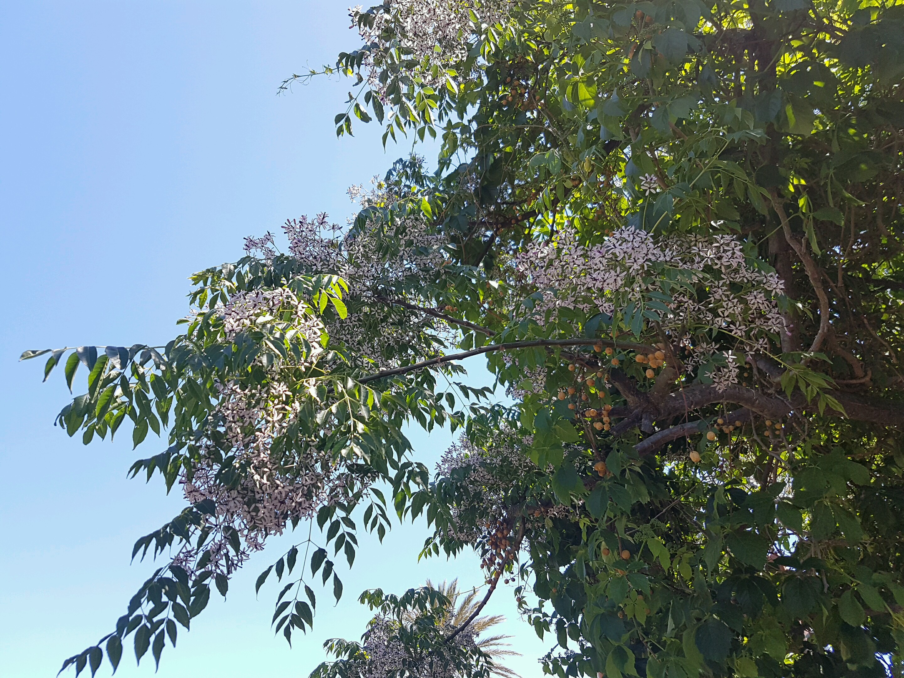 erkennt jemand diesen Baum? Ich bin leider nicht 100% sicher, ob Blüten und Früchte zum Baum gehören, denn da rankt auch noch eine Pflanze durch den Baum.