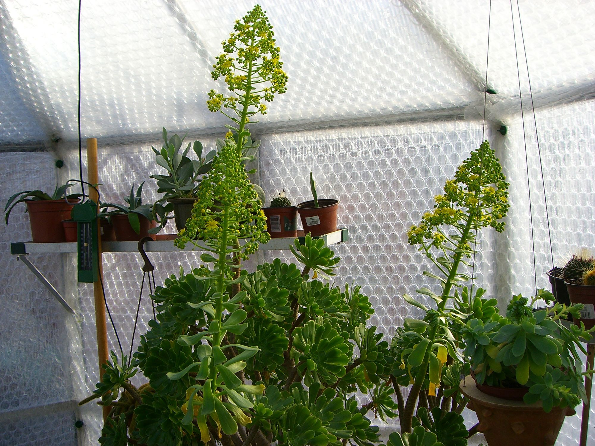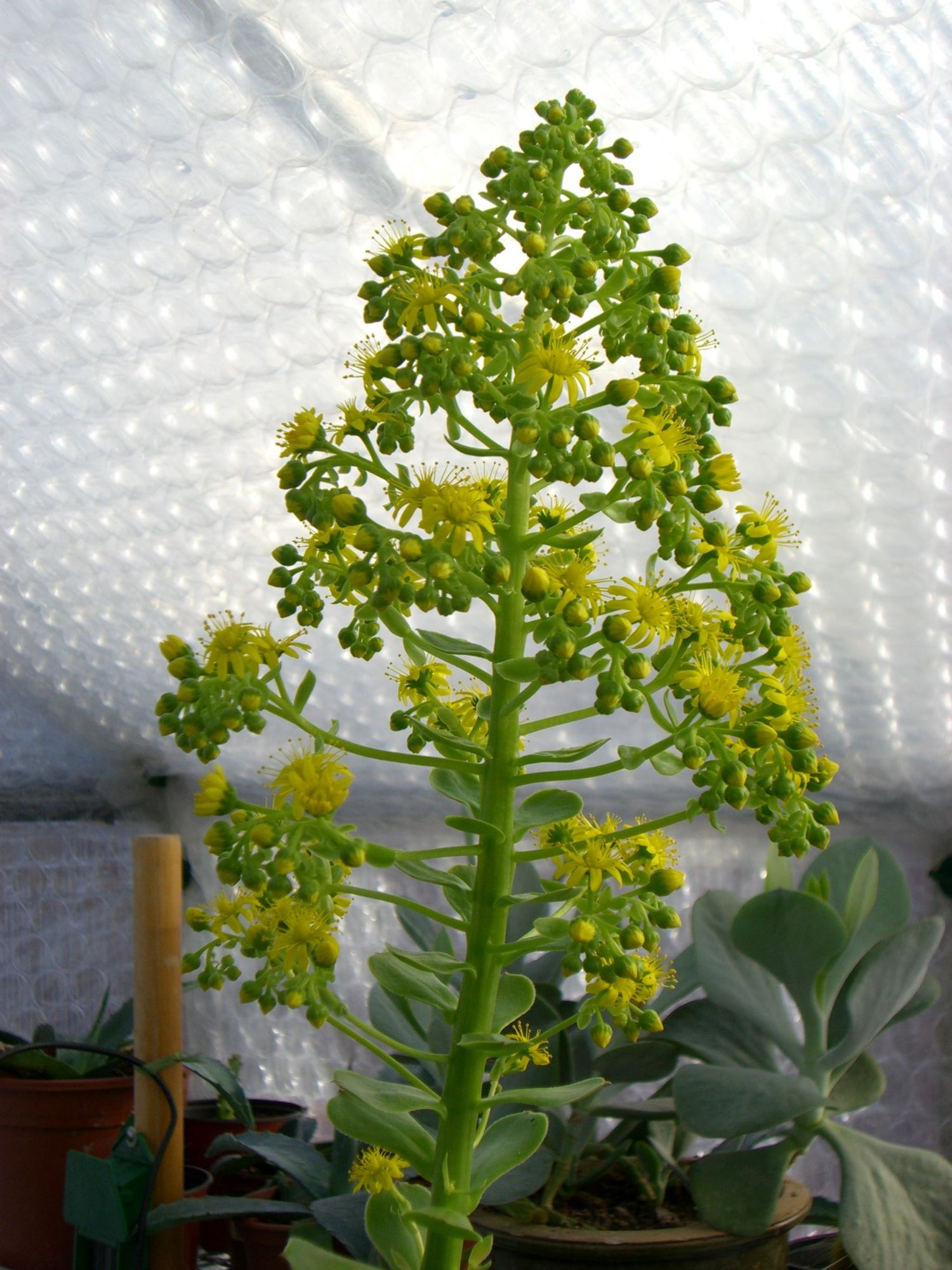 Immergrüner, bis 150 cm hoher, wasserspeichernder, schwachwüchsiger Strauch mit großen, gelben Blütenständen im Frühjahr