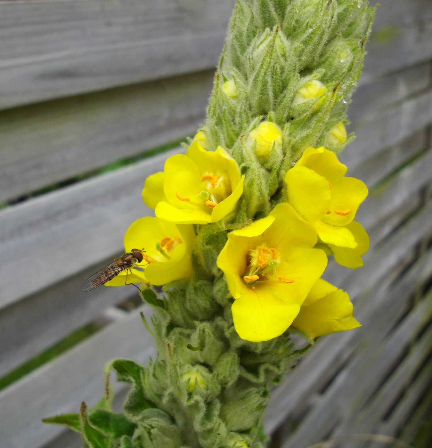 Königskerze (da Sie sich selber den Platz am Zaun ausgesucht hat, weiß ich nicht sicher welche genau, tippe aber auf die Kleinblütige Königskerze...)