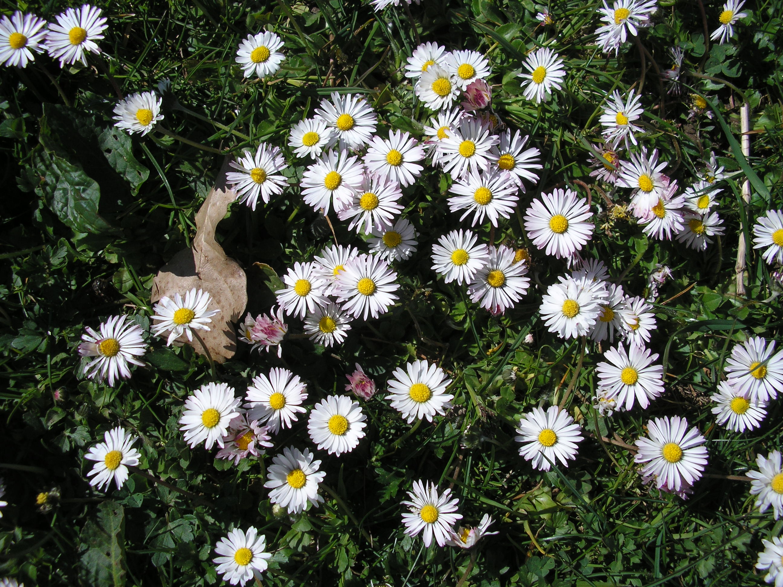 Besonders im Frühling kann ein, von vorneherein als solcher geplanter, Kräuterrasen ein wahrer Blütenteppich sein. Das Gänseblümchen ist hier die brauchbarste Blume und man kann seine Samen gleich bei der Einsaht des Rasens mitaussähen. (Hab ich gemacht) Bei mir haben sie sich jetzt im dritten Jahr dermaßen gut ausgebreitet, das der Rasen geradezu weis schimmert....