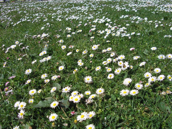 Besonders im Frühling kann ein, von vorneherein als solcher geplanter, Kräuterrasen ein wahrer Blütenteppich sein. Das Gänseblümchen ist hier die brauchbarste Blume und man kann seine Samen gleich bei der Einsaht des Rasens mitaussähen. (Hab ich gemacht) Bei mir haben sie sich jetzt im dritten Jahr dermaßen gut ausgebreitet, das der Rasen geradezu weis schimmert....
