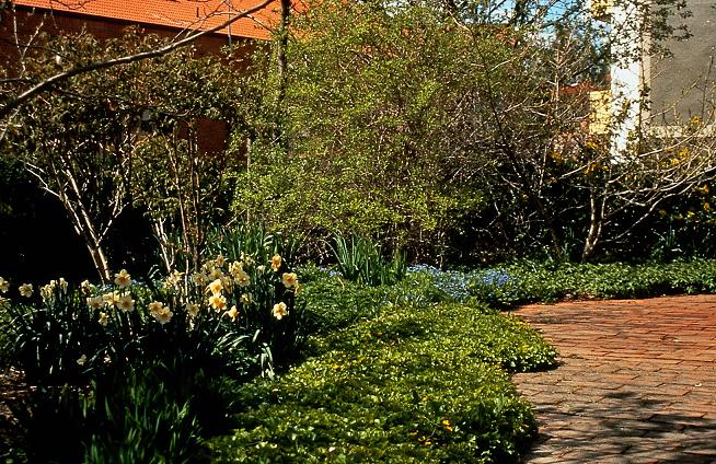 Schöne Bodendecker für lichtarme Gartenbereiche sind unter anderem Elfenblumen (Epimedium-Arten und -Sorten), Golderdbeeren (Waldsteinia ternata) und das Frühlings-Gedenkemein (Omphalodes verna). Elfenblumen sind zarte Schönheiten mit dekorativen, herzförmigen Blättern und zierlichen Blüten, die in der Tat wie kleine Elfen über dem Laub schweben. Die Blüten sind weiß, gelb, rosafarben oder rötlich und erscheinen im April und Mai. Obwohl diese Stauden sehr zart wirken, sind sie robust und sie sind gute „Laubschlucker“: Das Herbstlaub, das auf diese Stauden fällt, braucht nicht entfernt zu werden, denn es rutscht zwischen die Pflanzen bzw. unter die Blätter. Dort wird es dann von Bodenlebewesen zersetzt. Es trägt so zur Lockerung des Bodens bei und steht als Nährstoff für die Pflanzen zur Verfügung. Im Frühling blüht auch die sehr wuchsfreudige, etwa 10 Zentimeter hohe Golderdbeere. Die Form ihrer intensiv goldgelben Blüten erinnert an die Blüten der Erdbeere und auch die glänzenden, immergrünen Blätter ähneln denen einer Erdbeerpflanze.