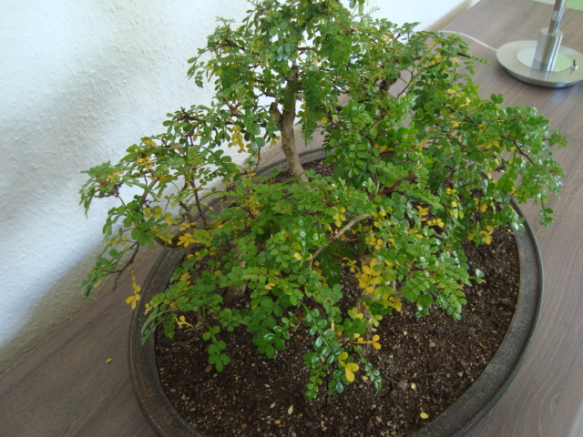 das Zimmer indem der Bonsai-Wald steht ist hell, jedoch bekommet der bonai ie dirketes sonnenlicht, ich giesse den Bonsai 2-3mal die woche wenn der obere Boden troken ist, auch gebe ich dem bonsai dünger, im gleichen raum sind noch 2 andere bonsai, die haben keine Probleme.....