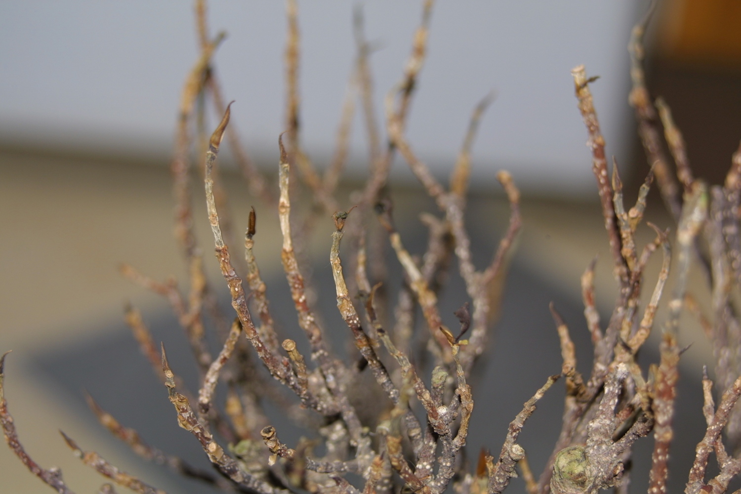 So, und nun sieht er so aus. Die Triebspitzen scheinen total vertrocknet.