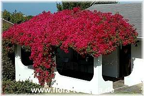 Schnitt: Ungeschnitten bilden Bougainvilleen meterlange Triebe, die Wände oder Klettergerüste begrünen. Allerdings lässt ganz ohne Schnitt die Verzweigung zu wünschen übrig und die Blüten entschwinden nach einigen Jahren dem Blickfeld, denn sie bilden sich vor allem an den Triebenden. Schneidet man Bougainvilleen im März und zusätzlich nach jedem Blütenschub zurück, lassen sie sich dagegen zu kugelförmigen, formschönen Büschen oder Stämmchen erziehen.