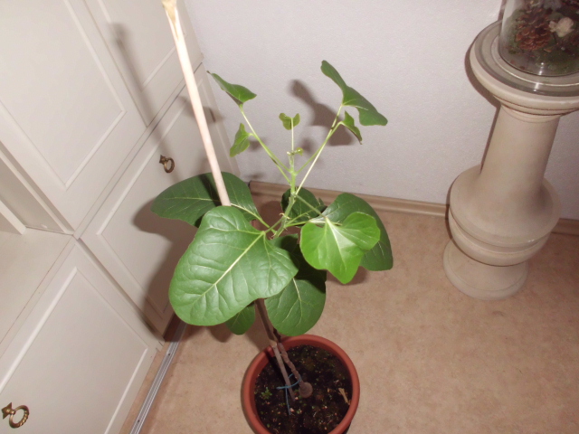 Die große Pflanze ist etwa 1,60 m groß (von der selben Aussaat). Die kann ich im Moment nicht fotografieren, weil sie draußen auf dem Balkon im Regen steht.