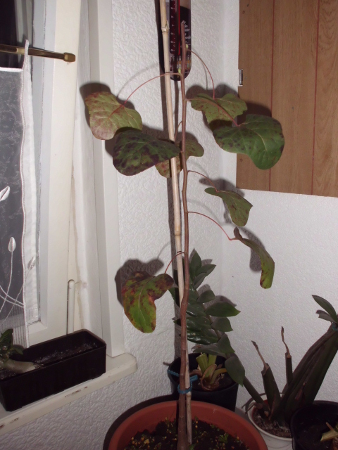 Die große Pflanze ist etwa 1,60 m groß (von der selben Aussaat). Die kann ich im Moment nicht fotografieren, weil sie draußen auf dem Balkon im Regen steht.