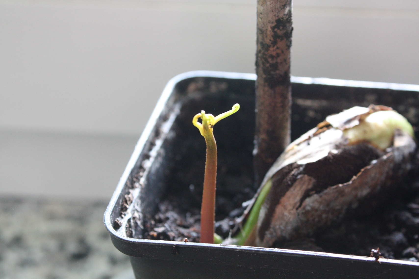 Eben habe ich entdeckt das der Kern aus dem ein Pflänzchen gewachsen ist mit Schimmel überzogen ist. Die Pflanze selbst sieht allerdings einigermaßen gesund aus, auch wenn sie deutlich kleiner als ihr Bruder ist.