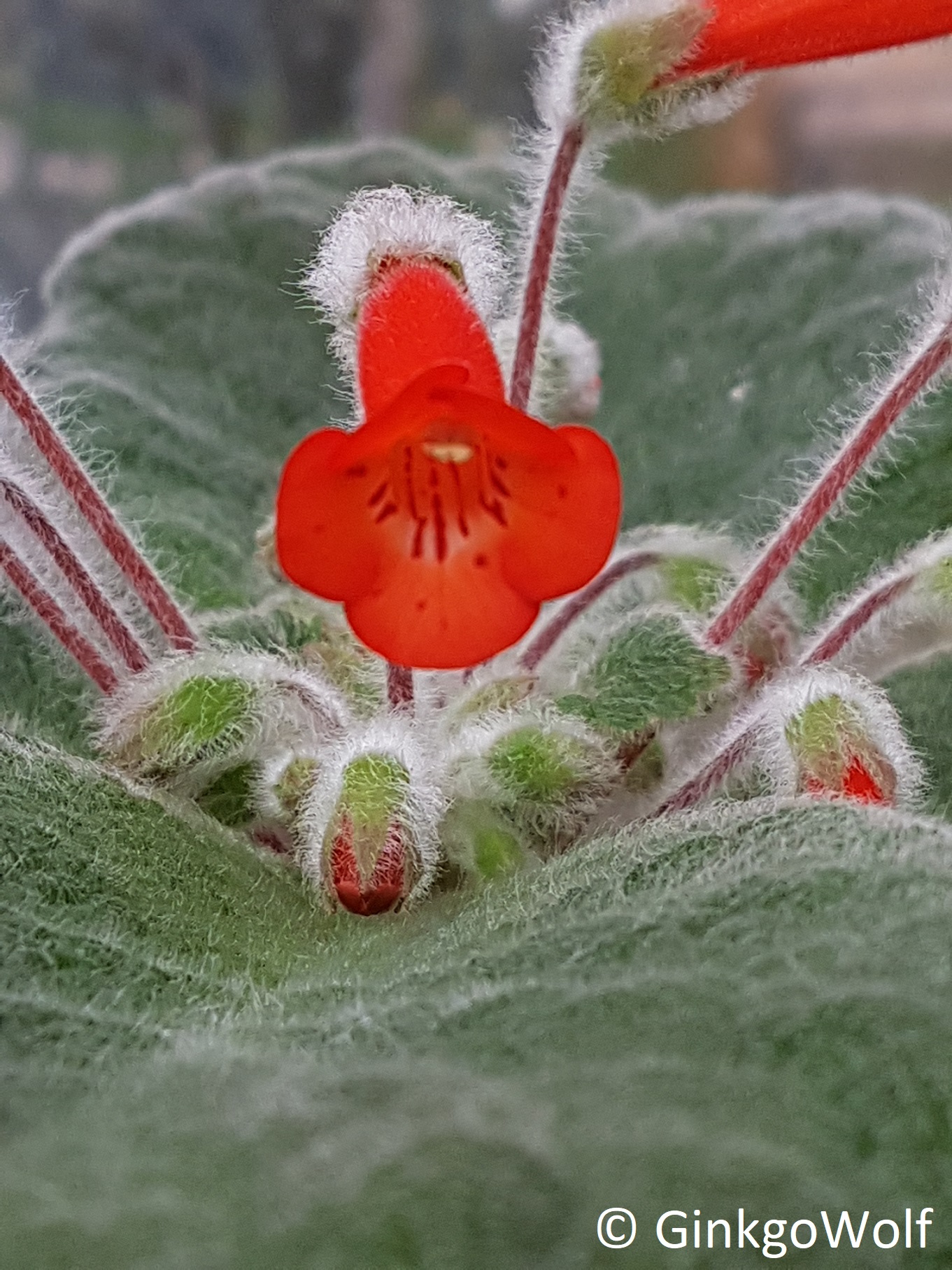 Auffällig ist, dass der Austrieb so gut wie mittig aus der Knolle kommt und insgesamt recht "plüschig" behaart ist. Auch die hübschen roten Blüten sind stellenweise behaart (vgl. Fotos).
