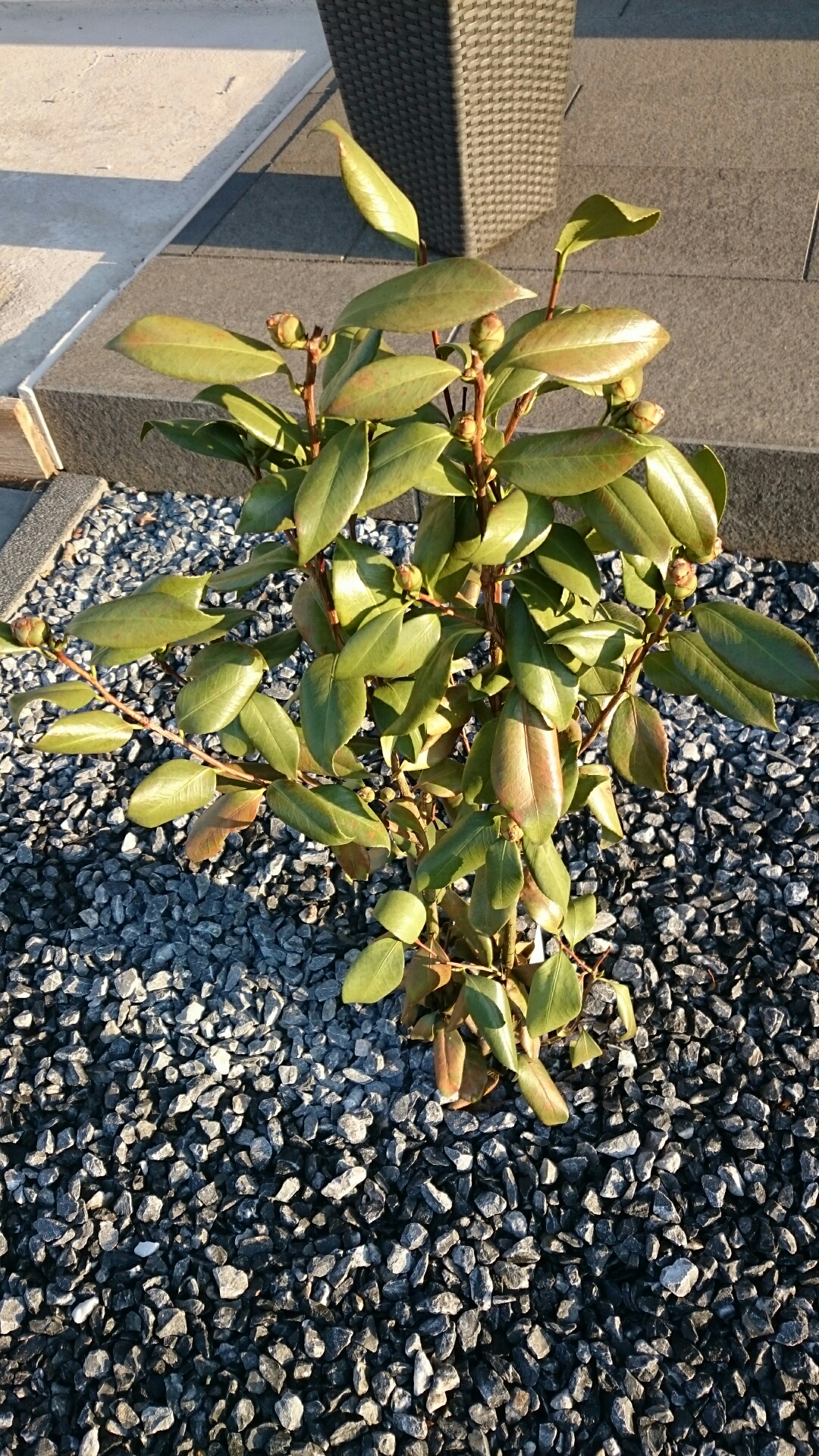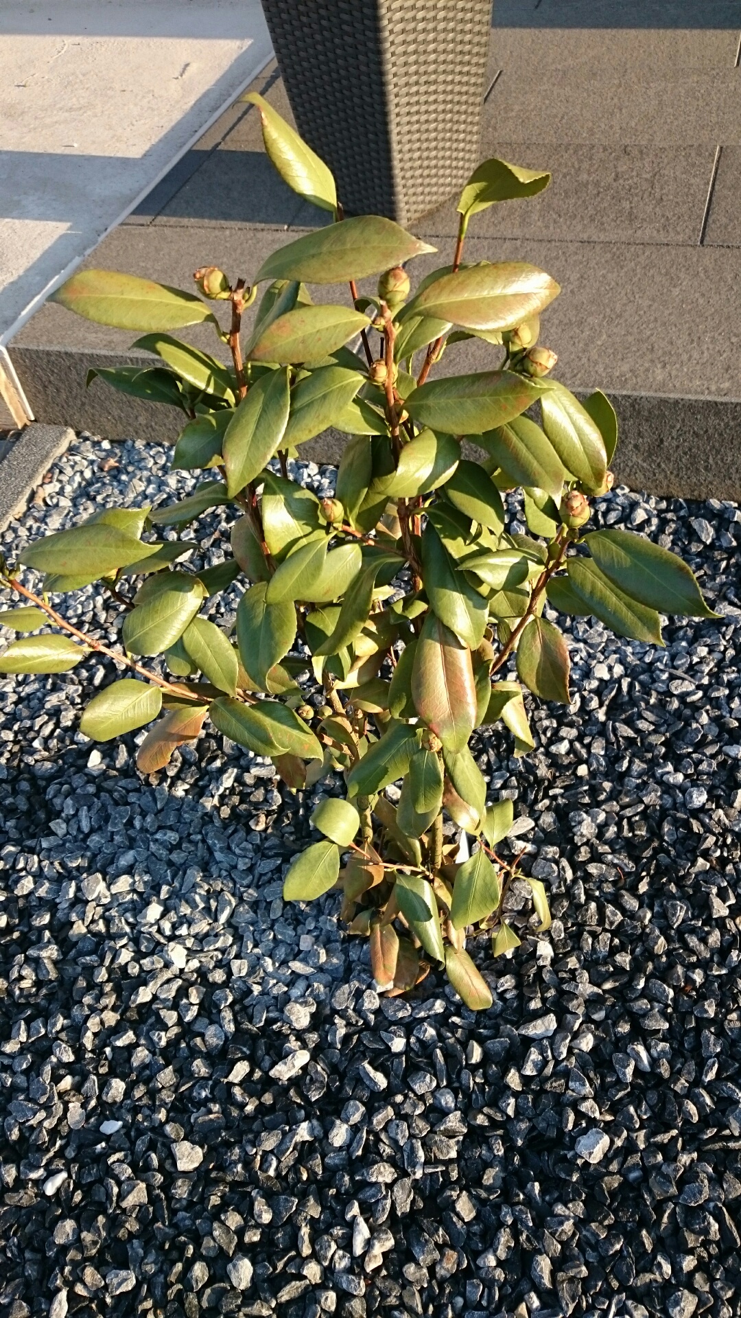 Die Kamelie steht jetzt seit knapp 3 Wochen im Beet und seit gut 10 Tagen beobachte ich, daß sich mehr und mehr Blätter an der Pflanze braun färben.