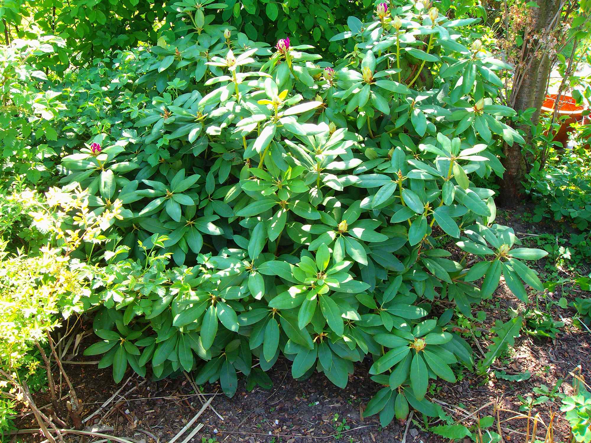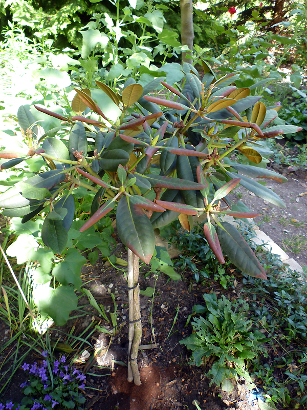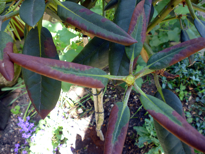 guckt mal, was mein Rhododendron an einer Seite macht. Die andere schaut gut aus. Einige der braunen Blätter sind schon abgefallen. Im Netz habe ich nur gefunden, dass eingerollte Blätter auf Wassermangel oder Nässe hindeuten. Beide kann ich ausschließen, denke ich. Zumal der Befund nur an einer Seite auftritt. Die andere ist unauffällig.