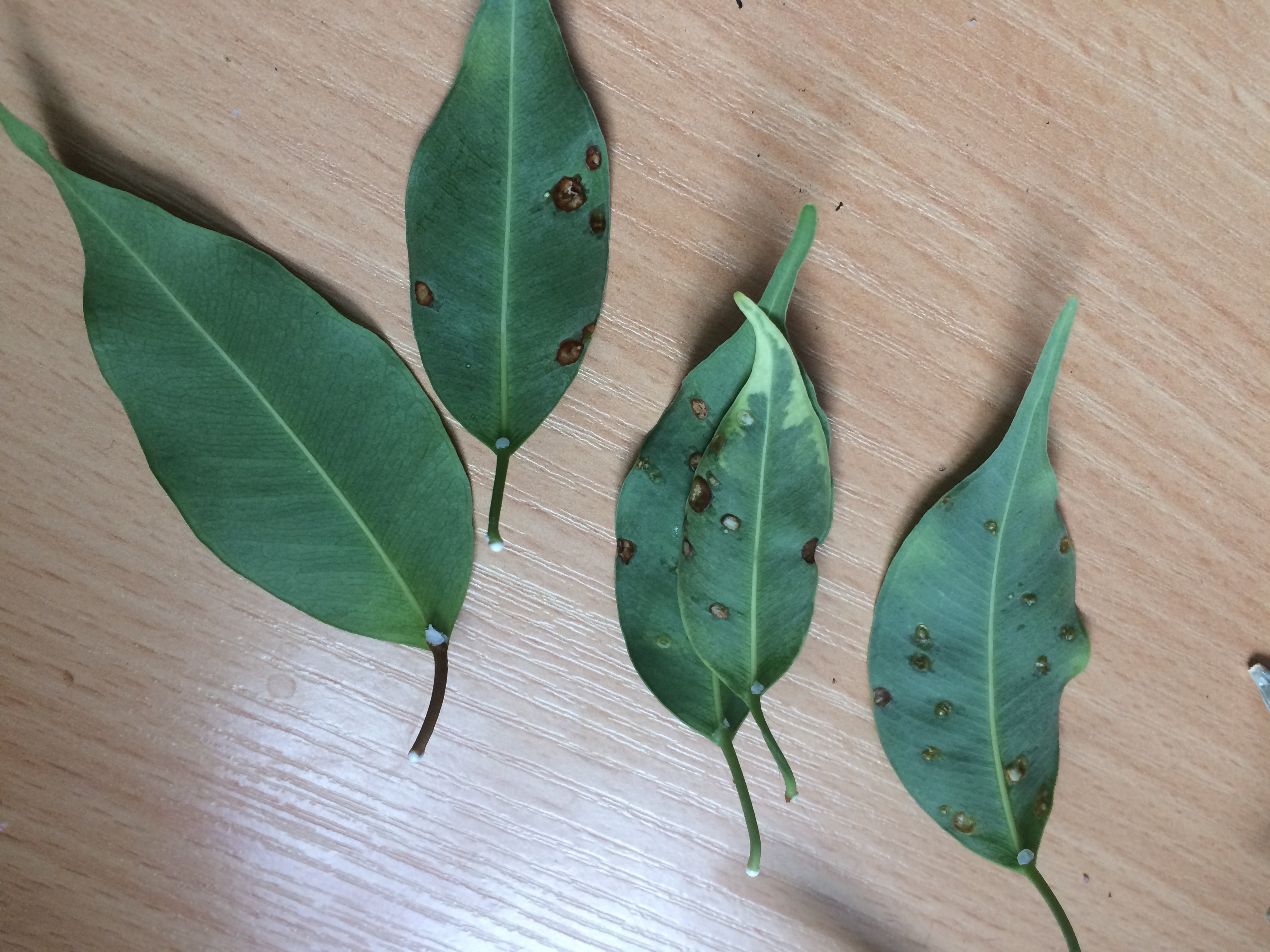 Ist anhand der Fotos nicht eindeutig zu bestimmen. Ich sehe braune Flecken (die können eingetrocknetes Blattgewebe sein oder Schildlaus'panzer') schwer zu sagen. Irritierend für mich sind die teilweise waserklaren Tropfen, die auf etlichen dieser Flecken sitzen. Bei einer anderen Pflanze hätte ich Guttation vermutet - ich hab die in diesem Ausmaß aber noch nie an einem Ficus gesehen.