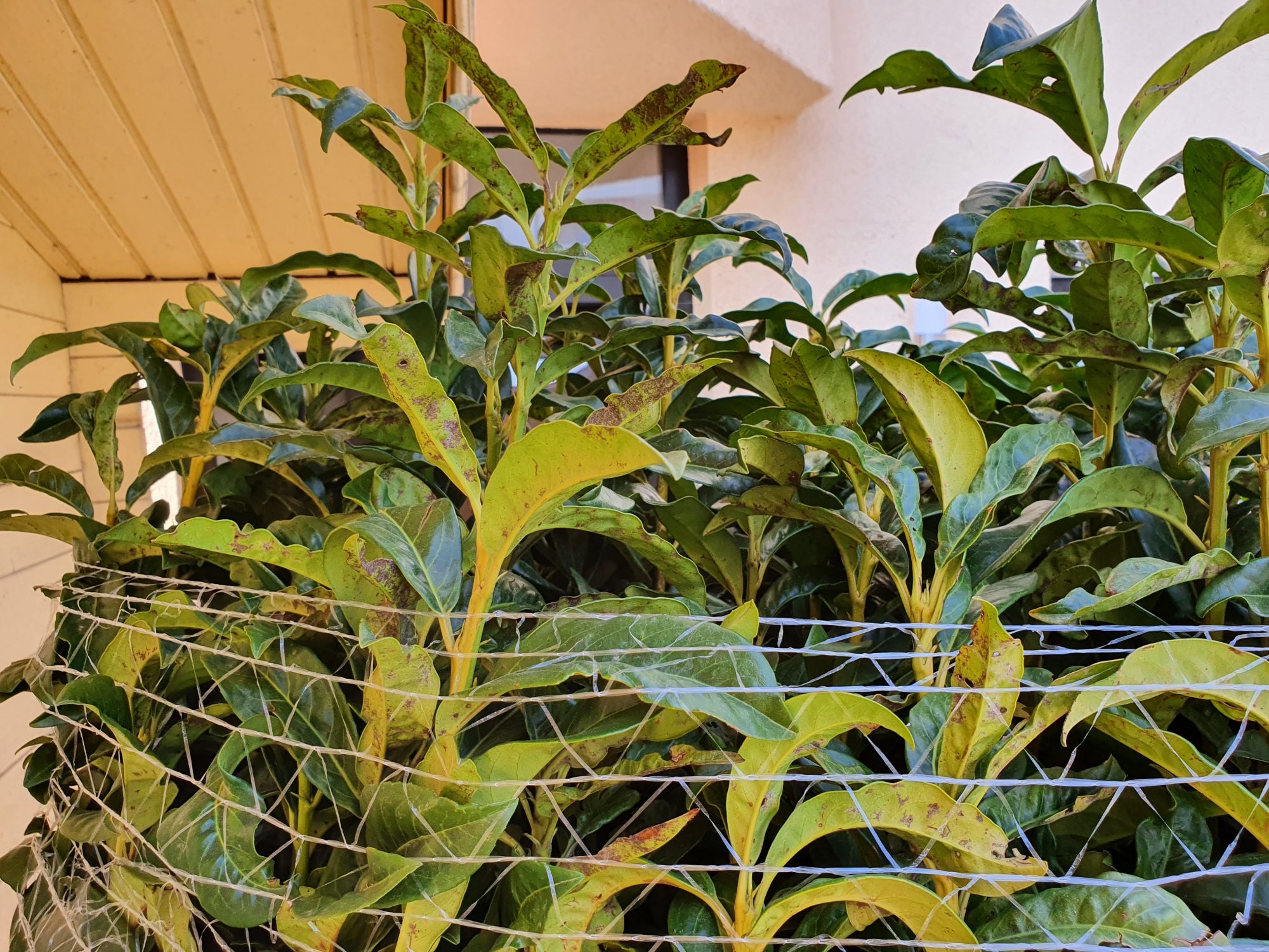 Alle Pflanzen haben an den oberen Blättern braune Flecken und Löcher.