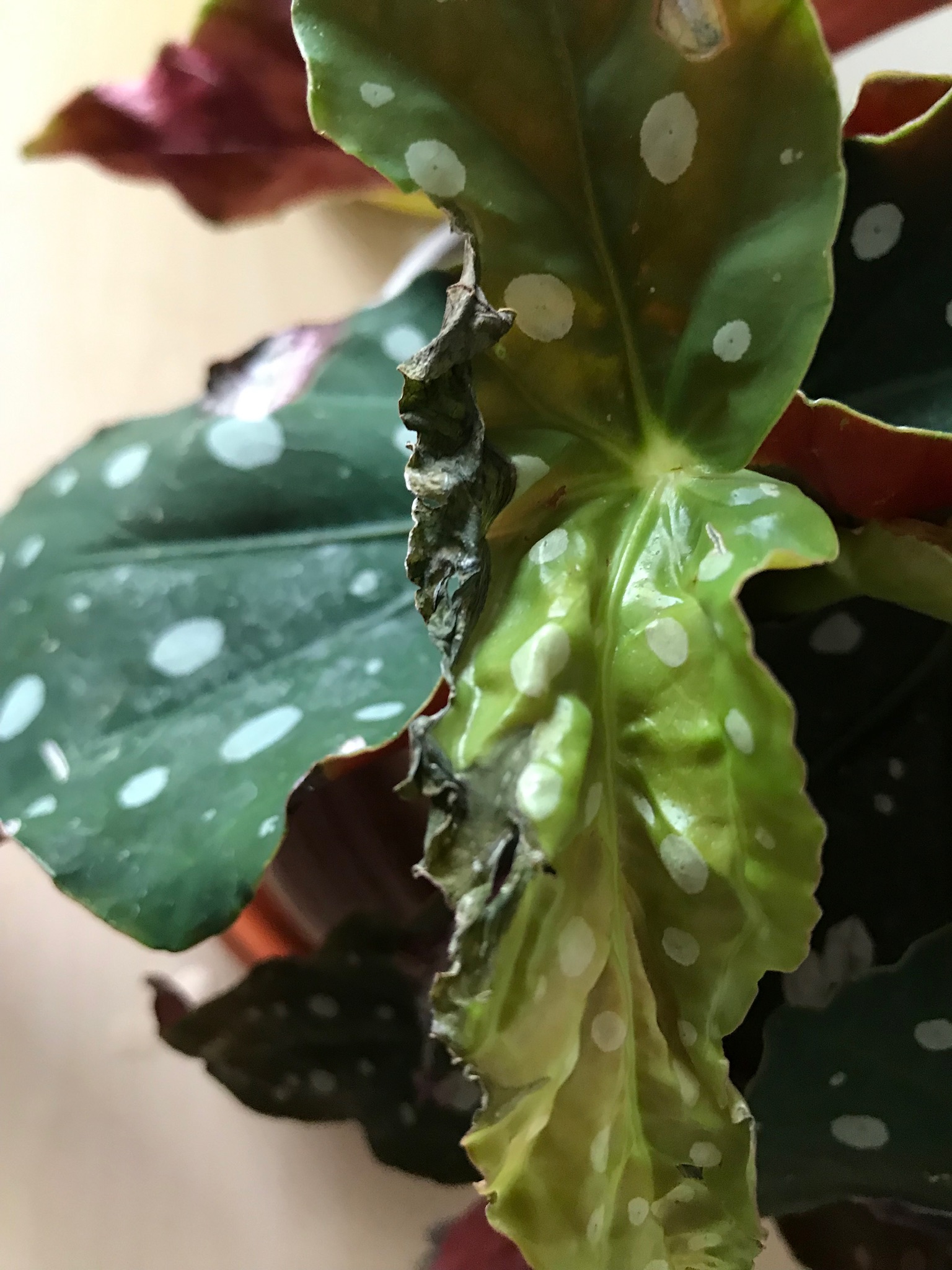 Jedenfalls sieht die Begonie echt mitgenommen aus .... die Blätter sind alle zu 60 % irgendwie demoliert, sprich, entweder so lila/braun/dunkle Flecken, oder sie kringeln sich trocken an den Spitzen ein oder an den Rändern oder die inneren, grünen Blätter sind ebenfalls hellbraun an den Rändern verfärbt.