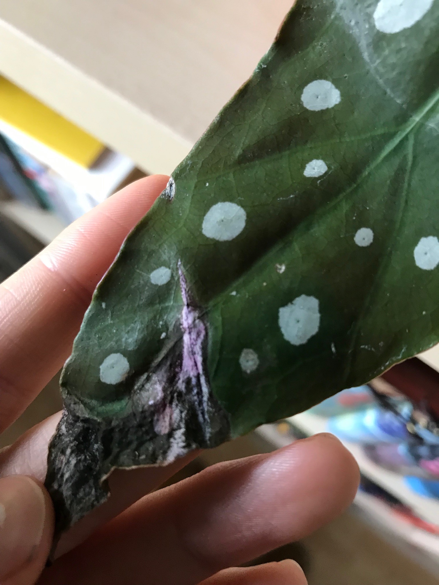 Jedenfalls sieht die Begonie echt mitgenommen aus .... die Blätter sind alle zu 60 % irgendwie demoliert, sprich, entweder so lila/braun/dunkle Flecken, oder sie kringeln sich trocken an den Spitzen ein oder an den Rändern oder die inneren, grünen Blätter sind ebenfalls hellbraun an den Rändern verfärbt.