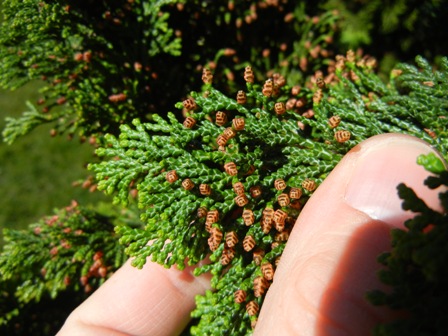 auch Koniferen blühen . Das sind die männlichen Kätzchen von Chamaecyparis obtusa ´Nana Gracilis´. Sie ist also erwachsen geworden . Wenn sie dann im Herbst dies hier bekommt, sind das die Früchte der kleinen Frühlingsorgie