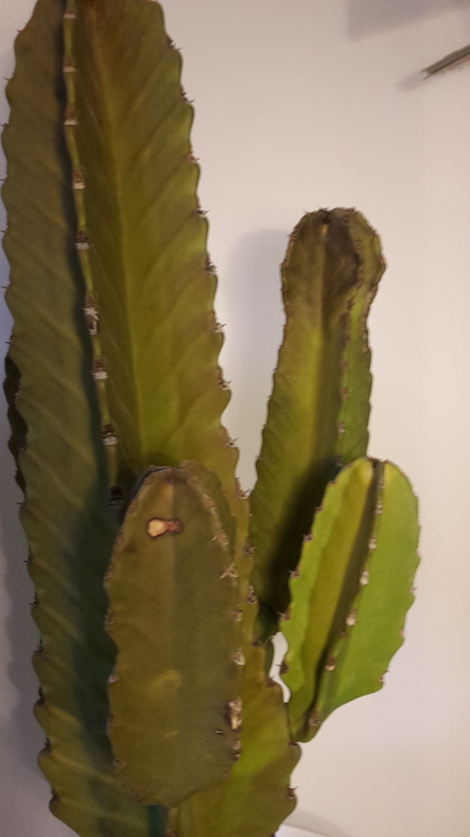habe mir vor ca 4 Jahren bei Ikea einen vermeintlichen Kaktus gekauft. Seid einiger Zeit weist dieser einige braune, weiche Flecken auf. An der Spitze, als auch am unteren Teil. Habe sofort angefangen zu recherchieren und herausgefunden, dass es sich um eine Euphorbia (ingens?) handelt.