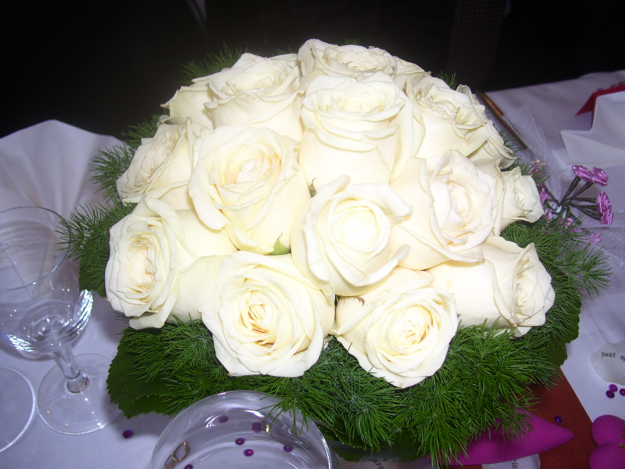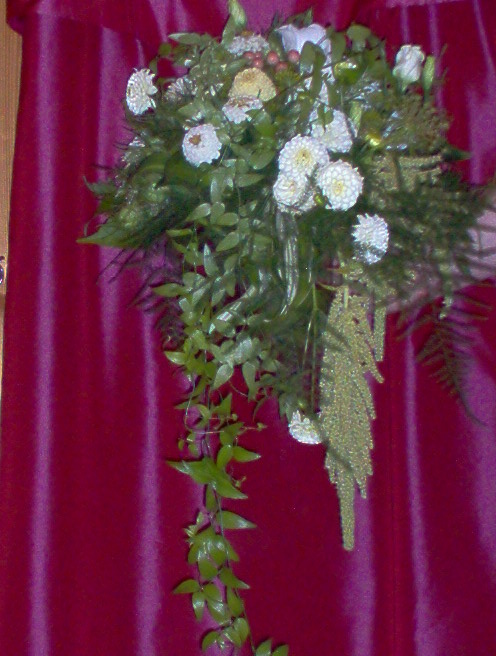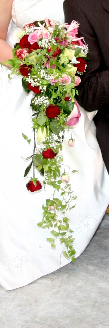 Hier nun also mein Schmuckstück mit vielen Rosen in rot und rosa, Callas, Schleierkraut usw.: