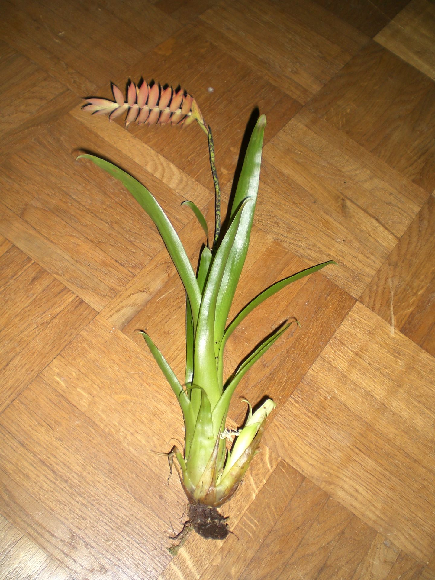 Auf diese Weise treibt jetzt mein erstes und kräftigstes Vrieseakindel (die Mutterpflanze (ein Schwert) hatte ich als Zwergvriesea gekauft, wenn ich den kleinen Topf daneben halte, wo die Mamapflanze einst drin stand, ist sie mindestens 4 mal so groß) nach gut 1,5 Jahren eine Blüte, wie ich gestern mit Freude festgestellt habe.