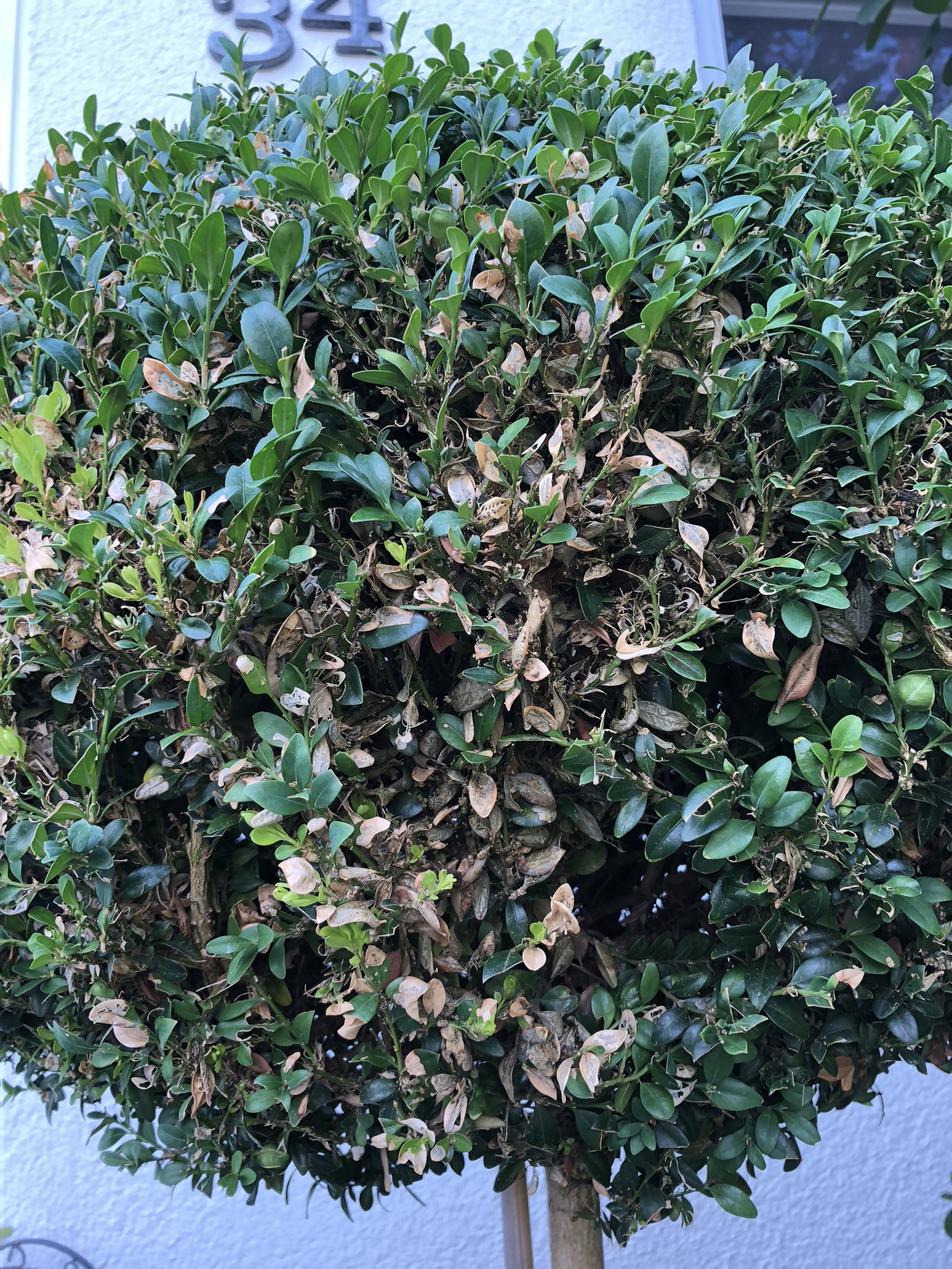 Der Buchsbaum (Hochstamm) hatte in Frühjahr den Buchsbaumzünsler dran, ich konnte ihn nicht ganz entfernen. Aktuell verenden aber immer mehr Blätter und ich weiß nicht ob das Spätfolgen sind, oder da nich etwas anderes Ursache sein kann.