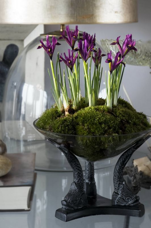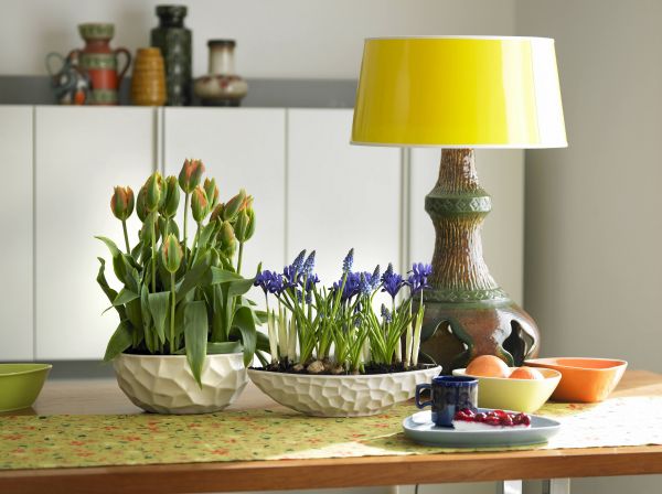 Das Spektrum der derzeitig erhältlichen Frühlingsblumen reicht von zierlichen Krokussen und Blausternchen über Vorfrühlingsanemonen, Zwergiris, Schachbrettblumen und Traubenhyazinthen bis hin zu den bekanntesten Frühblühern, den Narzissen, Tulpen und Hyazinthen. Die kleinen, meistens schwarzen Töpfe, in denen die Zwiebelblumen oft angeboten werden, lassen sich mit schönen Übertöpfen schnell und leicht kaschieren. Die Wahl der passenden Gefäße für die Frühlingsboten bietet viel Freiraum für das effektvolle Spiel mit Farben. Sie können zum Beispiel den gleichen Farbton wie die Blüten haben oder in einer kraftvollen Komplementärfarbe gewählt werden. Die Variante für Entdecker und Retrofans: Den Keller oder Dachboden auf der Suche nach alten ausrangierten Töpfen aus den 50er oder 60er Jahren durchforsten. Die Gefäße kommen so zu neuen Ehren, genauso wie so manches Schätzchen vom Flohmarkt.