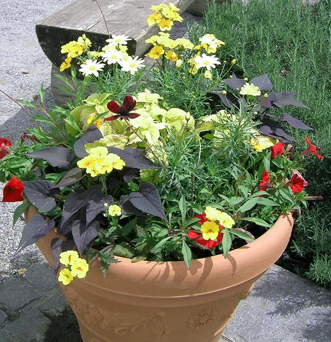 Neben unterschiedlichen Formen kann man beim Laub auch mit Farben spielen, denn die Farbpalette mancher Blätter macht den Blüten ernsthaft Konkurrenz: sie reicht von Weiß über Gelb und Blau bis hin zu Rot, Kupfer und sogar Violett. Modern wirken beispielsweise das grüngelbe Pfennigkraut (Lysimachia) zusammen mit den dunkelvioletten Blättern des Dreieckigen Glücksklees (Oxalis). Daneben gibt es viele zweifarbig gemusterte Pflanzen wie beispielsweise Goldsalbei (Salvia 'Icterina') oder Buntsegge (Carex 'Evergold'). Zartes Gelb und Grün teilen sich hier ein Blatt und sorgen so für Spannung im Topfgarten. Noch bunter wird es mit dem dreifarbigen Salbei (Salvia 'Tricolor'), der weiße, rotviolette und grüne Verzierungen auf seinem Laub vereint. Die Buntnessel (Solenostemon) zeigt sich sogar mit vier Farben und einer lebhaften Musterung auf den einzelnen Blättern.