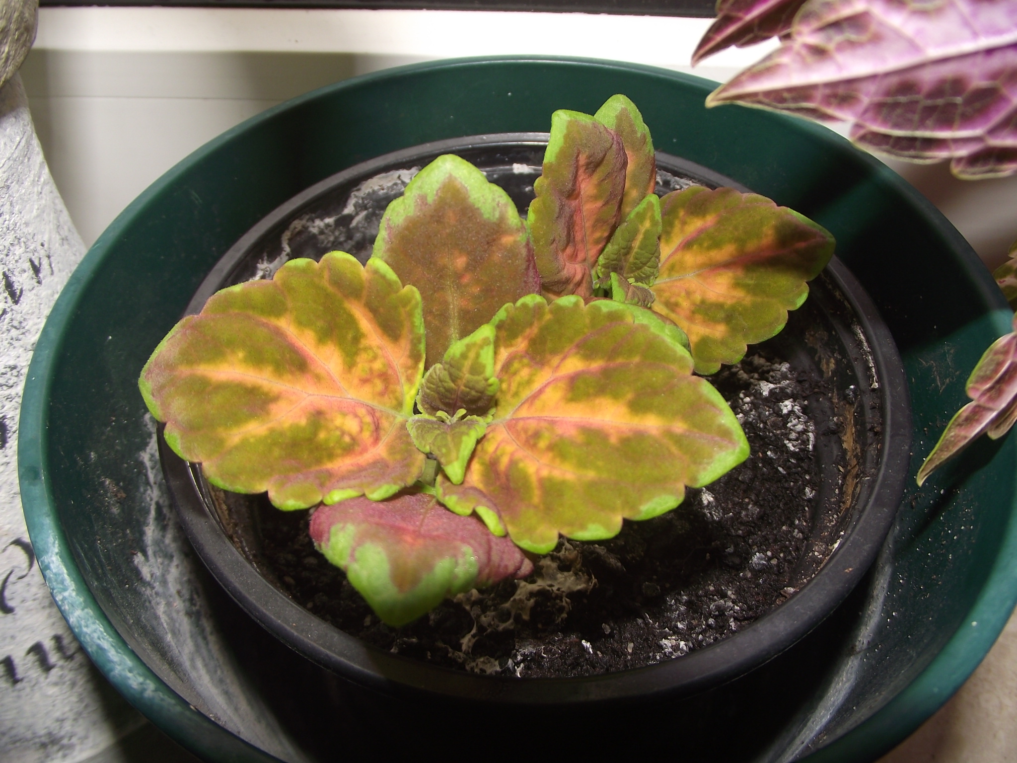 Letztes Jahr hatte ich diese Buntnessel mit dem herrlichen hell- und weinrot. Die Stecklinge sind alle kaputt gegangen, aber ein Ast, der irgend wann abgebrochen war, hatte Wurzeln gezogen. Er war sehr verwachsen und ich hatte keinen guten Platz für ihn. Irgendwie hat er aber überlebt und ich habe ihn dann an einen sonnigern, aber kältern Platz gestellt. Die Farben wurden leuchtender, aber beim Gießen neigt sich irgendwann die Pflanze. Schnell noch einen Steckling schnitten und ich dachte, die Bunti ist hinüber, Wurzelfäule. Sie wurde aber nicht eingegangen, sie hat an die Wand gelehnt und mit Stützen überlebt. Der Steckling hat sich toll entwickelt und kommt demnächst auch raus.