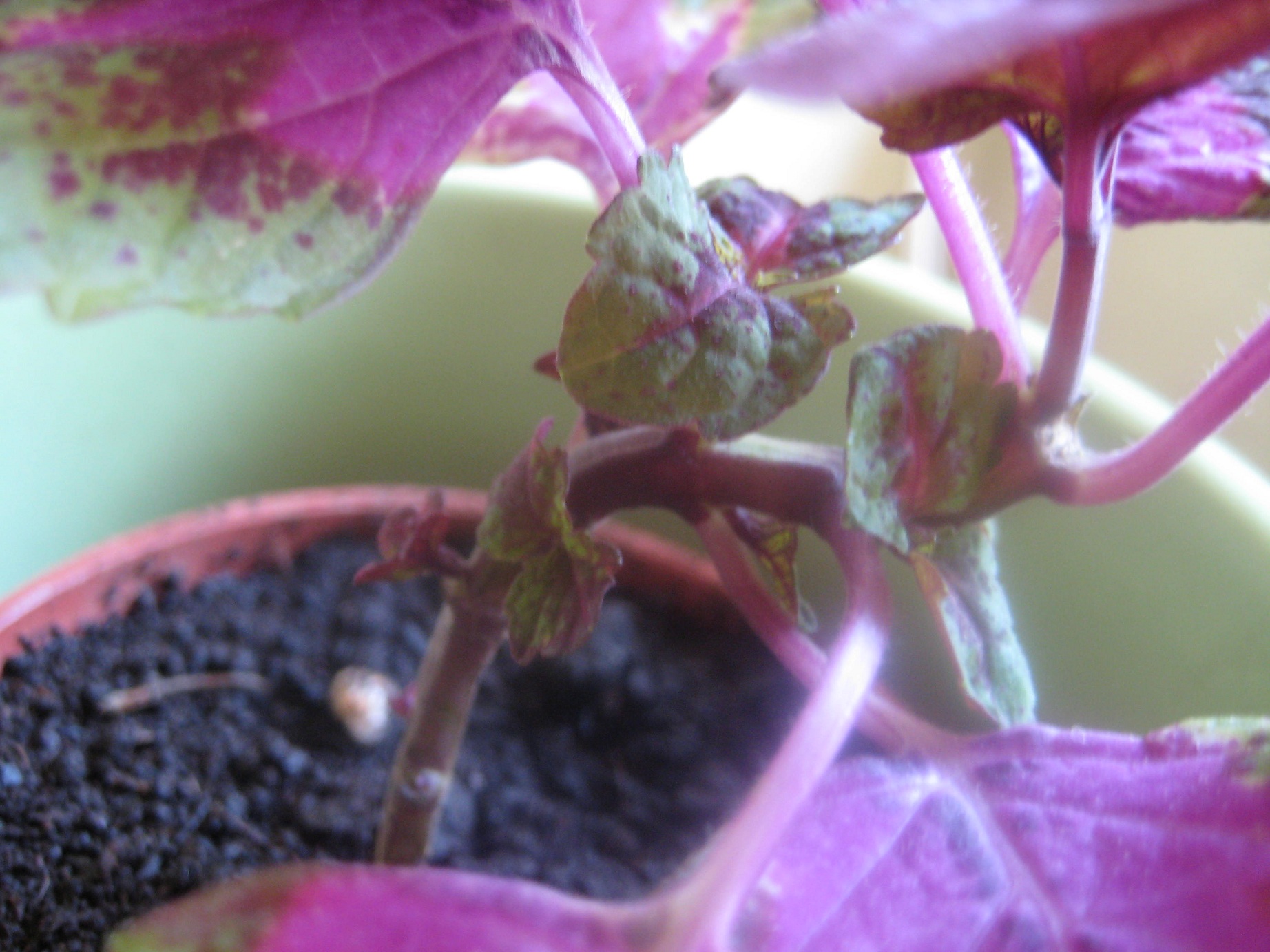 Vielleicht weiß ja sogar jemand hier, welche Sorte das sein könnte? Die zwei linken sind von Mutter X, die rechte von Mutter Y, aber X und Y sind damals beide von der gleichen Mutter geschnitten worden. Man sieht, dass die rechte vorher in der Sonne stand. Da werden die Blätter dann komplett rot bis lila. Die beiden linken waren im Halbschatten. Und die Nahaufnahme ist auch von der rechten Pflanze, um zu zeigen, was seit dem passiert ist...