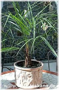 Schnitt: Kappen Sie bei Palmen niemals die Spitze, da hier der einzige Vegetationspunkt sitzt. Schneiden Sie braune Blätter möglichst erst dann ab, wenn sie ganz eingetrocknet sind und die Pflanzen somit alle Reservestoffe aus den Blättern abgezogen haben. Es sollte stets ein Stück des Blattstiels stehen bleiben, damit die Stämme dick und gleichmäßig aussehen.