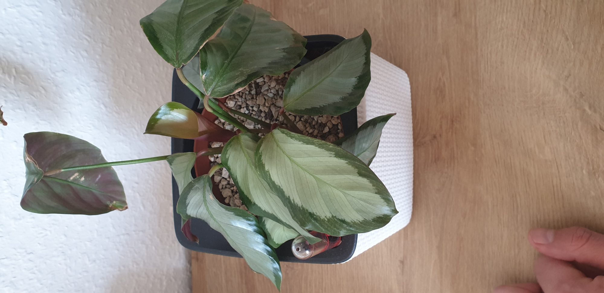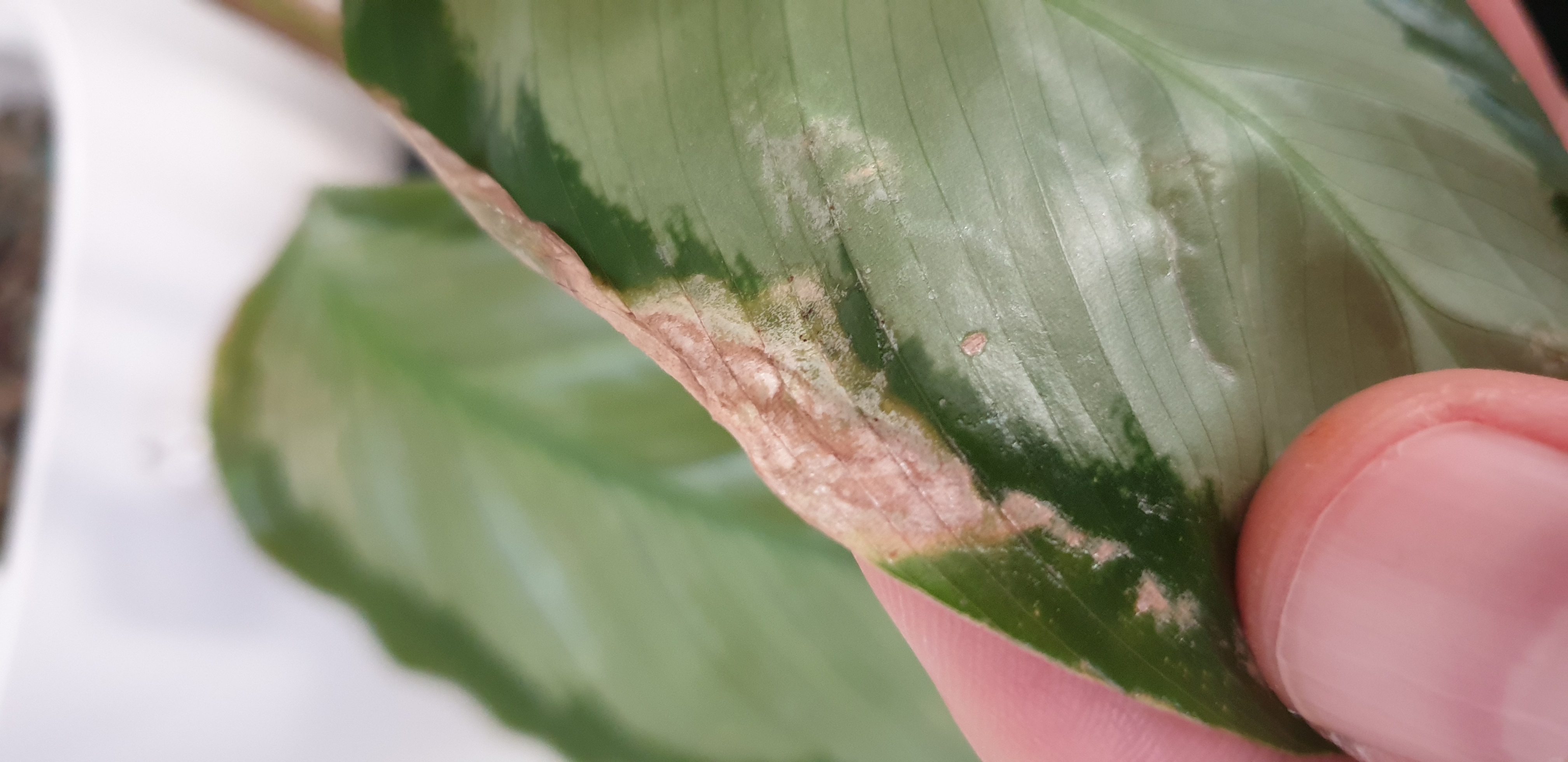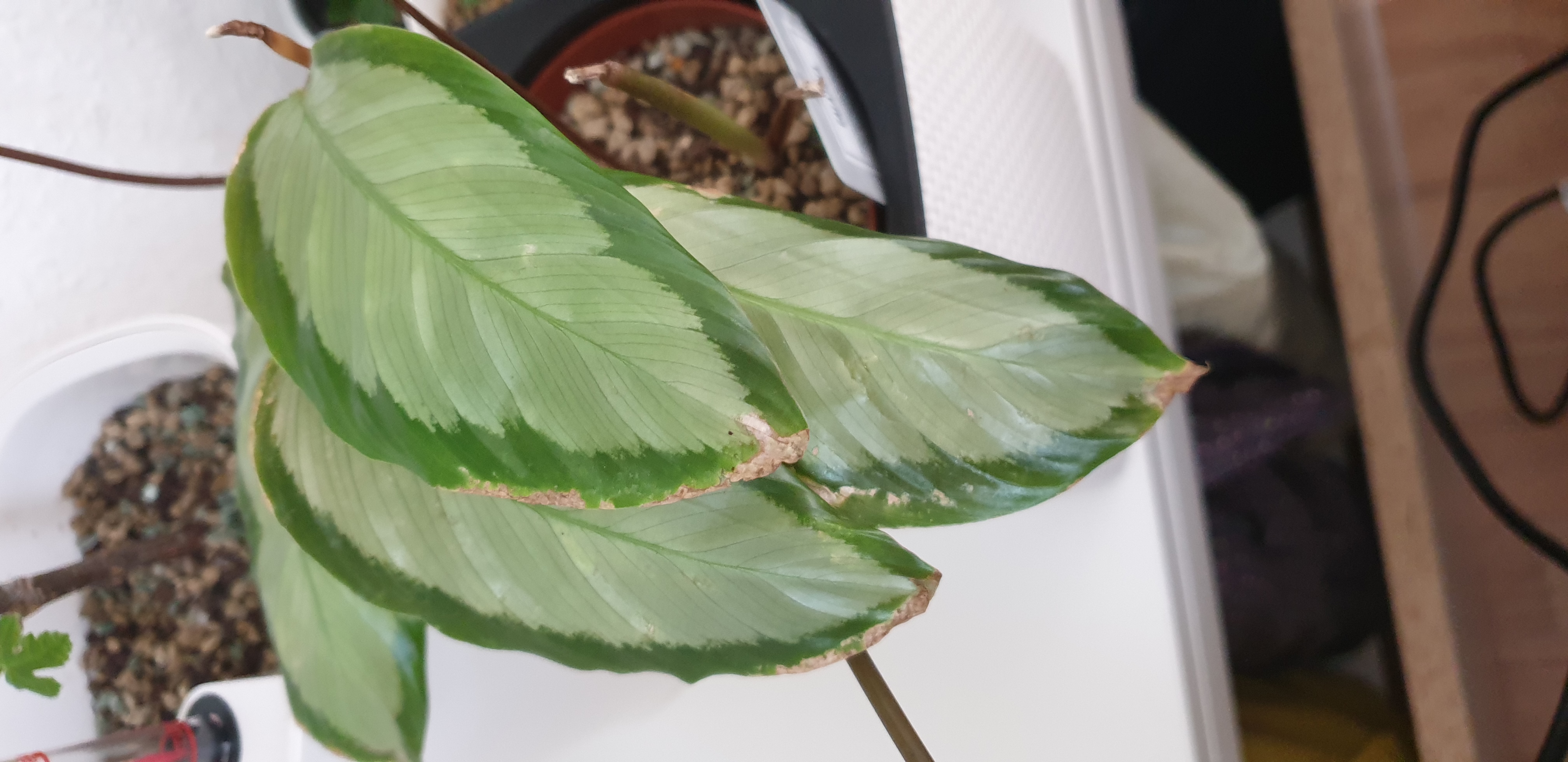 ich habe letztes Jahr eine Calathea gekauft und sie ist mehrere Monate wie verrückt gewachsen. Sie stand immer an demselben Ort (Regal in der Nähe eines Westfensters). Im Herbst habe ich dann beobachtet, dass fast alle Blätter schrittweise braune Stellen an den Rändern bekommen haben. Zuerst habe ich es auf zu trockene Luft zurückgeführt, obwohl die Luftfeuchtigkeit sich nicht geändert hat (Heizung war noch aus). Ich habe sie dann ins Badezimmer gebracht und gehofft, dass sie sich erholt. Dort wurde es aber eher schlimmer. Ich habe sie dann in mineralisches Substrat umgepflanzt (mineralisches Substrat (Lechuza Pon) und die schrecklichen Blätter entfernt. Ich habe sie an ihren alten Standort auf das Regal gestellt. Dort hat sie dann in kürzester Zeit sofort drei Blätter ausgetrieben. Diese sahen vollkommen gesund aus. Leider werden diese 3 Blätter aber mit der Zeit wieder schlimmer. Quasi von Tag zu Tag.