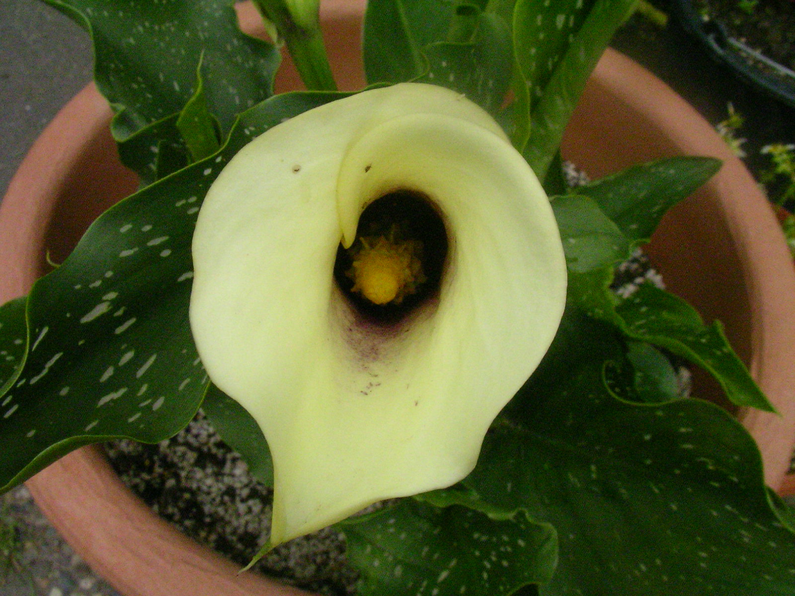 Ok, die Farbe hat nicht hingehauen; aber es ist eine wunderschöne, kräftige Pflanze geworden mit 2 Blüten !!! Und es ist meine erste gelbe Calla, ich finde sie ganz, ganz toll!!!