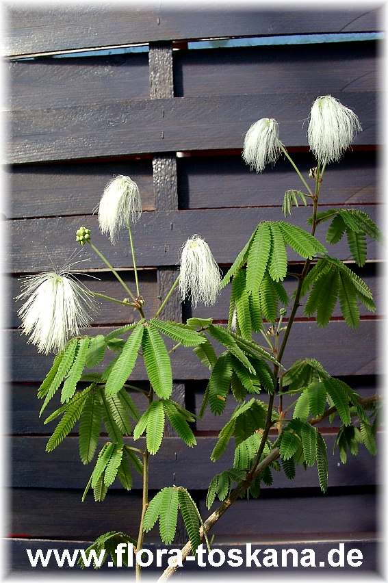 Reines Weiß ist die Farben-Wahl dieses südamerikanischen, immergrünen Strauchs. Im Vergleich zu seinen engsten Verwandten, den rot- und rosablühenden Puderquastensträuchern, sind seine Blüten jedoch weniger halbkreisförmig, als vielmehr fast kugelrund. Seine hellgrün gefärbten, akazienfeinen Fiederblätter, sind fein behaart, der Wuchs ist locker, die Rinde hellgrün. Damit bieten sich die filigranen Blütensträucher als schöne Begleiter in Wintergärten und sommerlichen Topfgärten an, die sich eleganten Pflanzen aus aller Welt verschrieben haben.