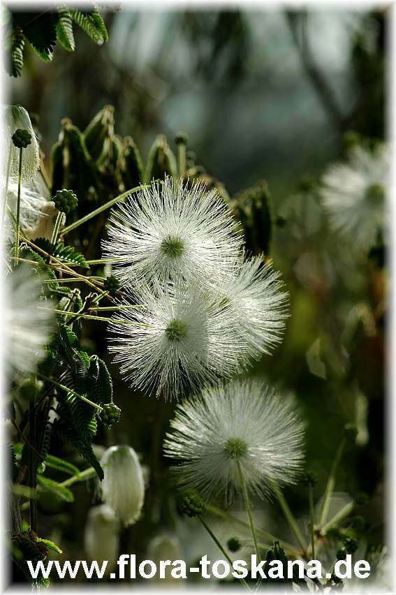 Reines Weiß ist die Farben-Wahl dieses südamerikanischen, immergrünen Strauchs. Im Vergleich zu seinen engsten Verwandten, den rot- und rosablühenden Puderquastensträuchern, sind seine Blüten jedoch weniger halbkreisförmig, als vielmehr fast kugelrund. Seine hellgrün gefärbten, akazienfeinen Fiederblätter, sind fein behaart, der Wuchs ist locker, die Rinde hellgrün. Damit bieten sich die filigranen Blütensträucher als schöne Begleiter in Wintergärten und sommerlichen Topfgärten an, die sich eleganten Pflanzen aus aller Welt verschrieben haben.