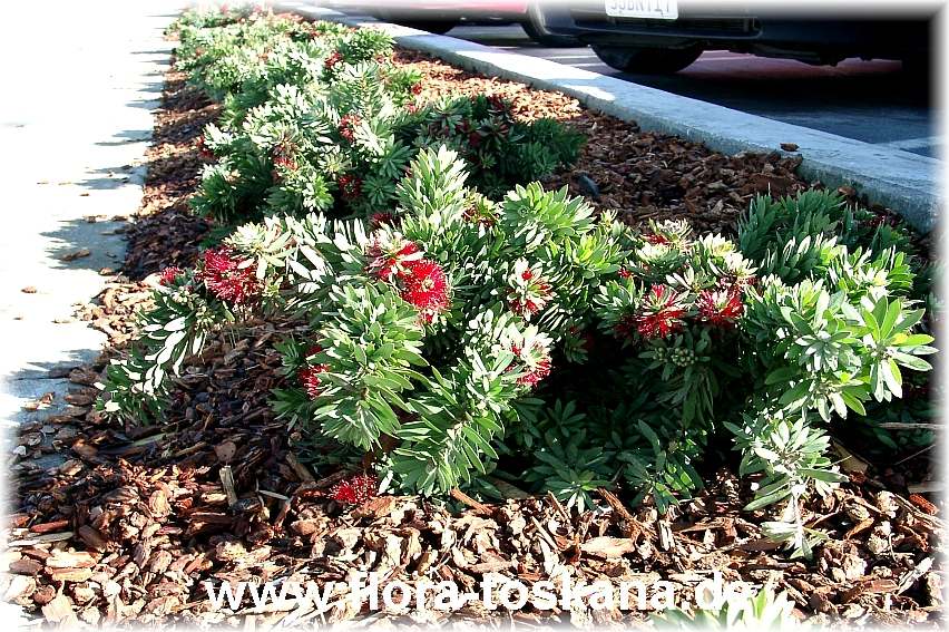 Info: attraktive rote Blütenzylinder aus feinen Staubfäden; schmales Laub & eleganter, überhängender Wuchs; mehrere Blütezeiten pro Jahr; immergrün & von Natur aus dicht wachsend & sehr gut schnittverträglich