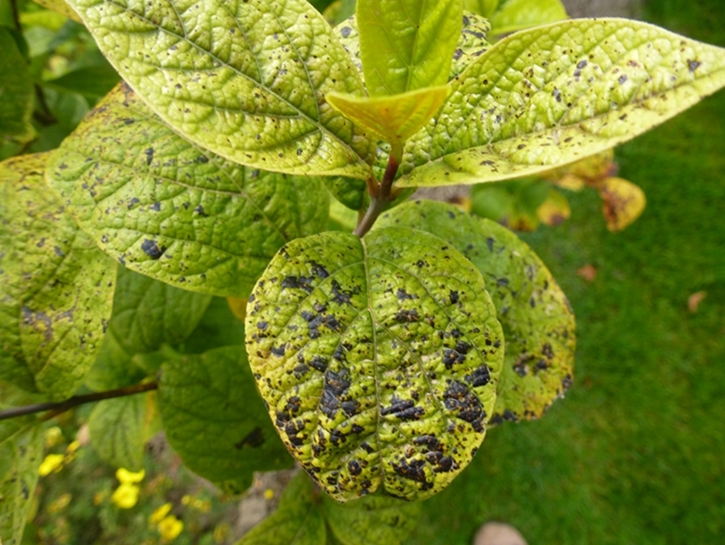 nun hat er schon über die gesamte diesjährige Vegetationsperiode schwarze Flecken auf den Blätter.