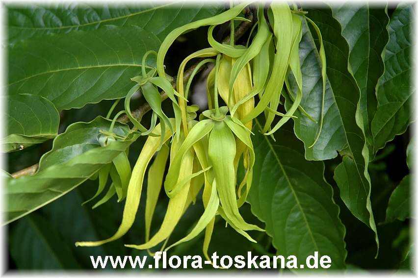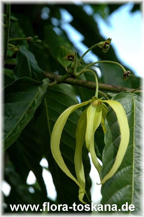 Allein schon beim Namen Ylang-Ylang steigt so manchem Duftkenner der facettenreiche, süßliche und angenehm schwere Duft von "Exotik, Tropen & Träumen" in die Nase. In natura ist das Parfum der Ylang-Ylang-Blüten ein noch größerer Genuss - und viel besser als ihr Destillat aus dem Ölfläschchen (Ätherische Öle), das in der Aroma-Therapie zur Pulssenkung und Atemberuhigung eingesetzt wird und einen beruhigenden Effekt auf Körper und Seele hat. Doch damit nicht genug: Die großen, gelben Blüten sehen mit ihren langen, in sich gedrehten Blütenblättern sehr schön aus und können stattliche 8 cm Durchmesser erreichen. Bereits 3-4 Jahre alte Pflanzen beginnen mit der Blüte in großer Zahl, bevorzugt in den warmen Sommermonaten. Ylang-Ylang wächst zu schlanken Bäumen mit aufstrebenden bis etagenartig angeordneten Ästen heran, die sich mit zunehmendem Alter überneigen oder schleppenartig wachsen. Je nach Überwinterungstemperatur sind sie immergrün oder tauschen ihr Laub während der Wintermonate aus.