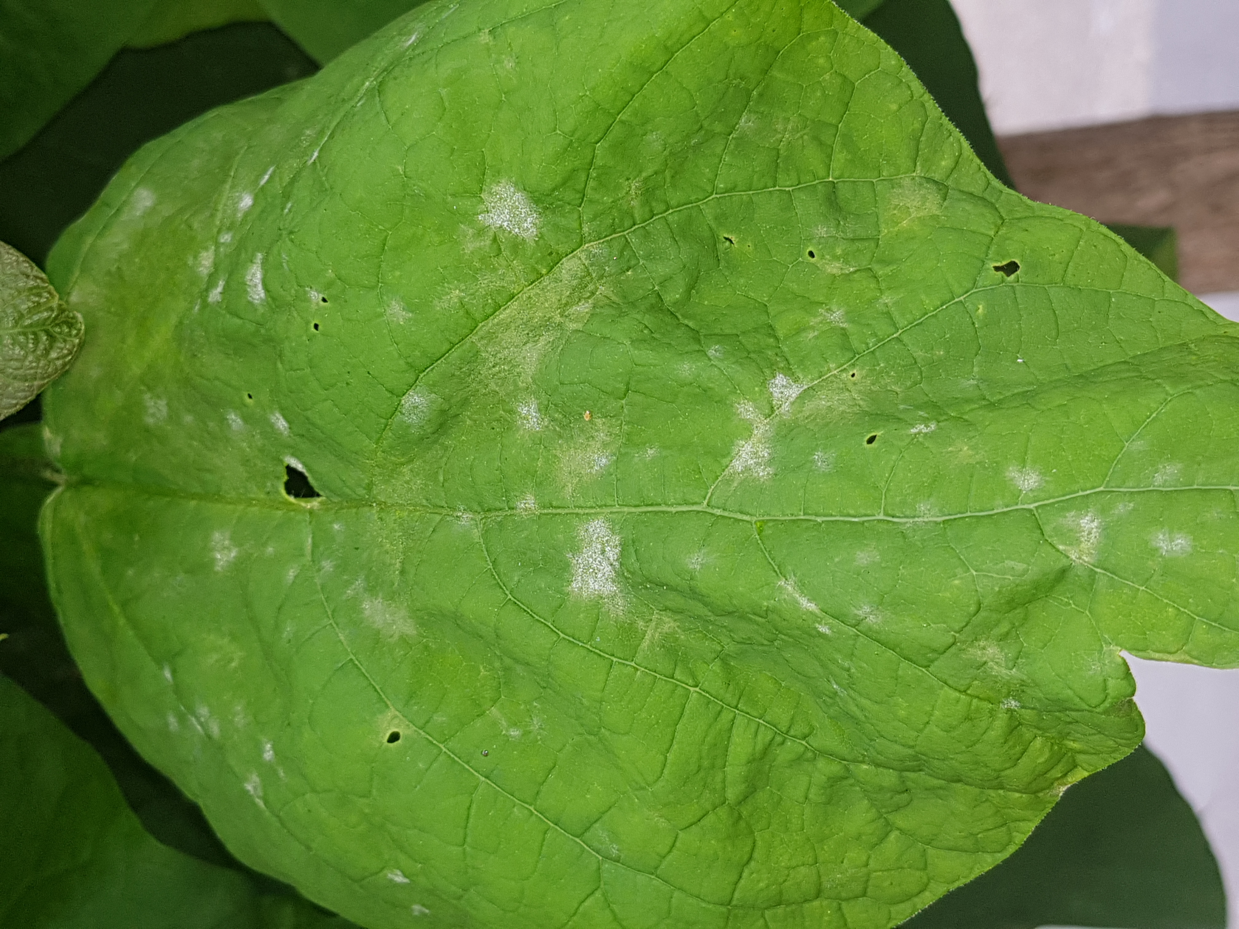 Hallo zusammen, dieses Jahr hat unser Trompetenbaum, neben den weißen Blattflecken, leider noch einen anderen Befall. Siehe Bilder. Bei den weißen Flecken gehen wir von eine Art Mehltau aus.
