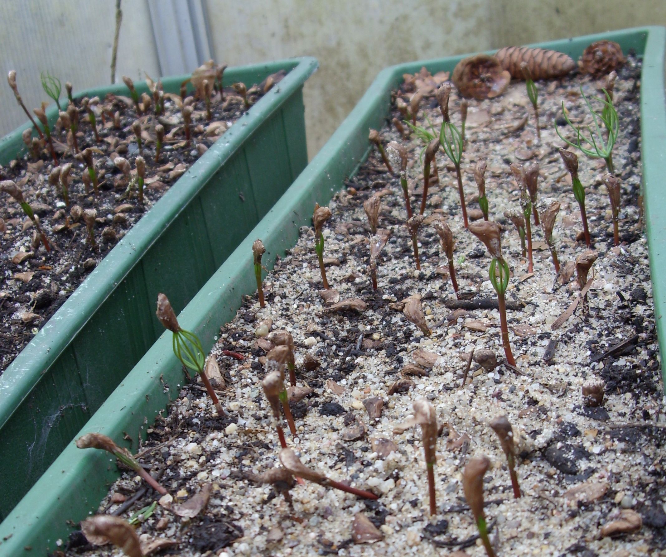 Die Samen habe ich vor einigen Wochen unter älteren Mutterbäumen gesammelt. Sie lagen also den gesamten Winter über, der Witterung ausgesetzt, unter den Bäumen und wurden quasi von der Natur selbst stratifiziert. Die Samenhülse öffneten sich bereits unmittelbar nach der Schneeschmelze, sie keimen aber seit dem sehr langsam. Ich habe die Samen auf ein Gemisch aus Garten-, Blumenerde und Sand gelegt. Eine spezielle Anzuchterde verwende ich für sie nicht. Die Zedern sollen gleich etwas tiefer wurzeln können, da Libanonzedern auf das Pikieren und Umpflanzen oft mit einer lang andauernden Wachstumspause reagieren.