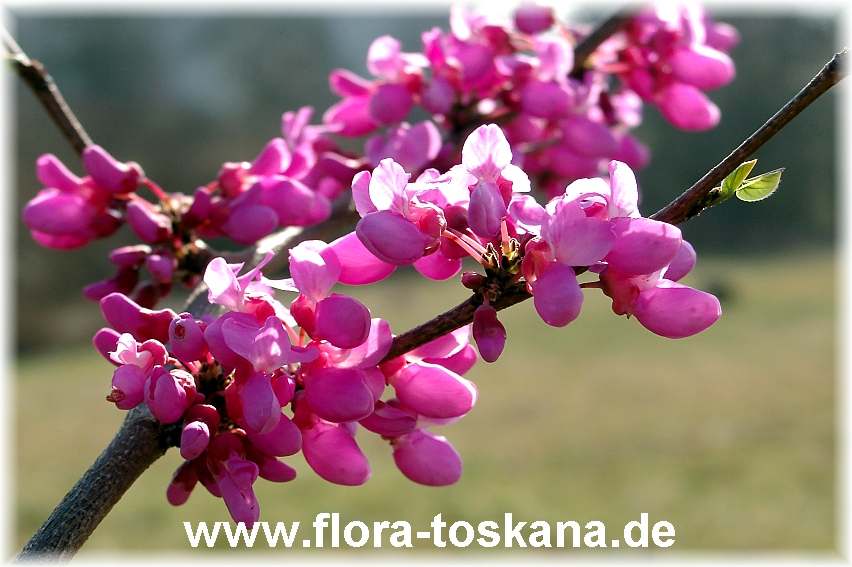 Info: leuchtend pinkfarbener & auffälliger Frühlingsflor (Kauliflorie) vor dem Laubaustrieb; herzförmige Blätter; individuell wachsende, oft knorrige Kronen; robust & frostfest