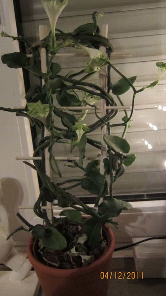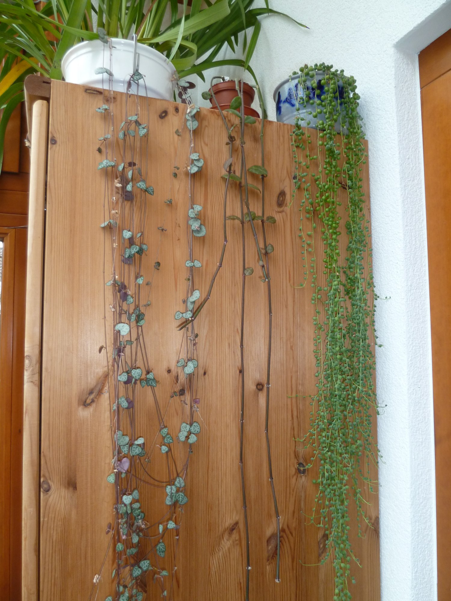 Meine steht auf dem Wintergartenschrank (die mittlere von den dreien, links ist meine woodii und rechts die Erbsen-Senecio, die demnächst blüht und bei der ich mich deshalb nicht so richtig an die dringend nötige Entlausung traue...) und hat lange blattlose Triebe, die aber noch ganz lebendig aussehen.