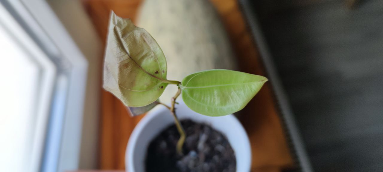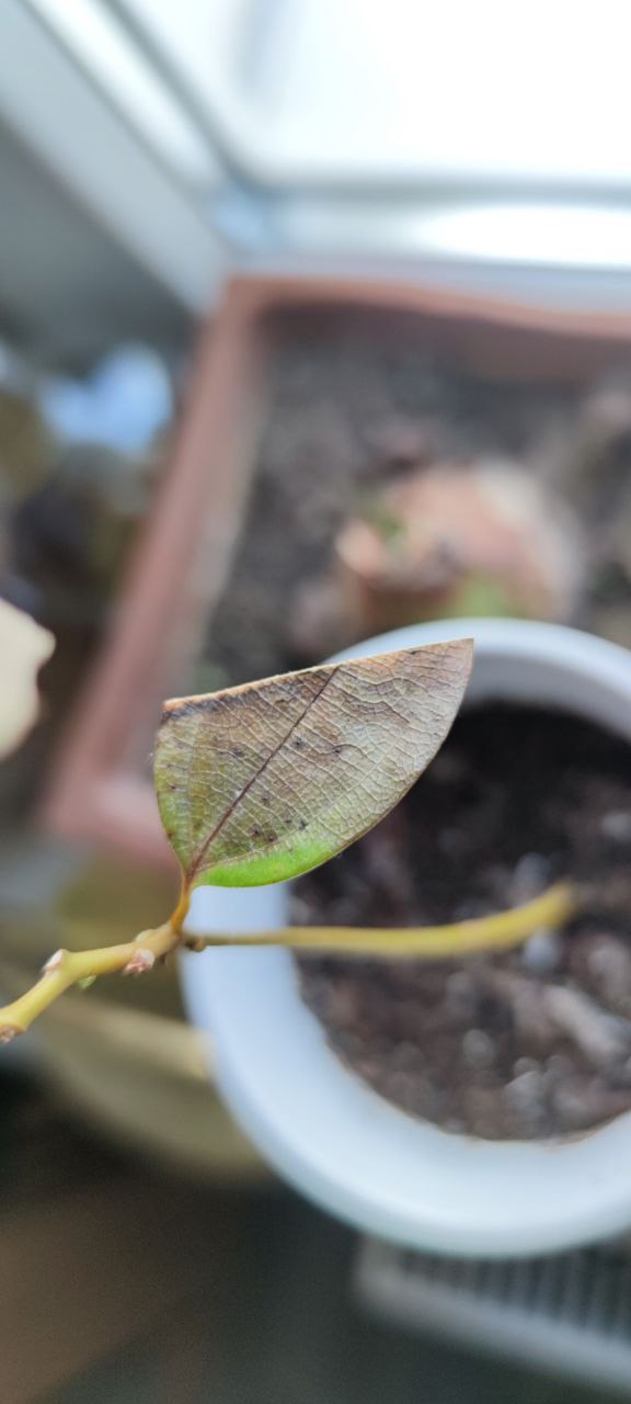 Auf dem anderen Bild ein noch gesundes neues Blatt und ein Blatt das gerade frisch anfängt abzusterben. Beide Blätter sind vor kurzem erst gewachsen.