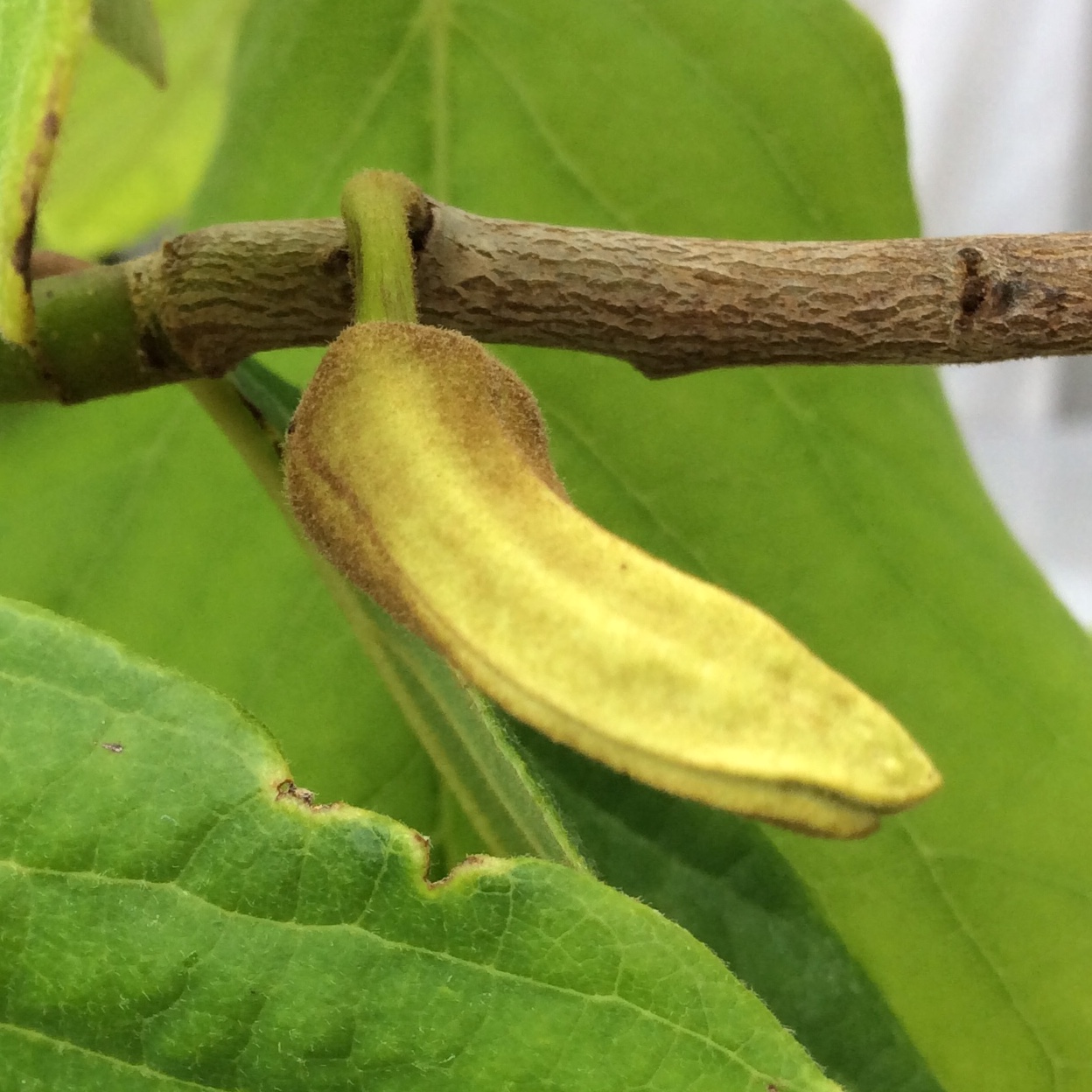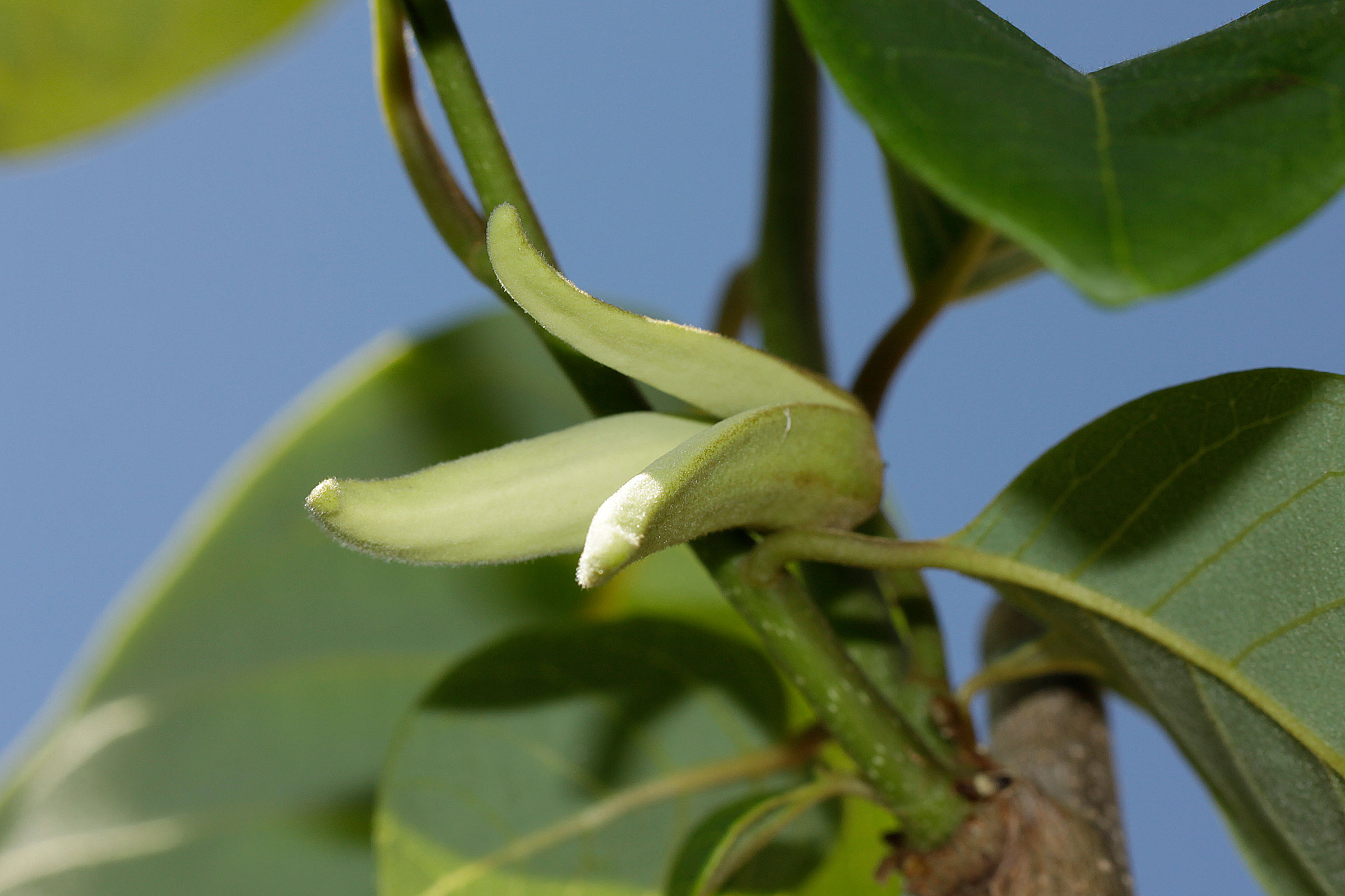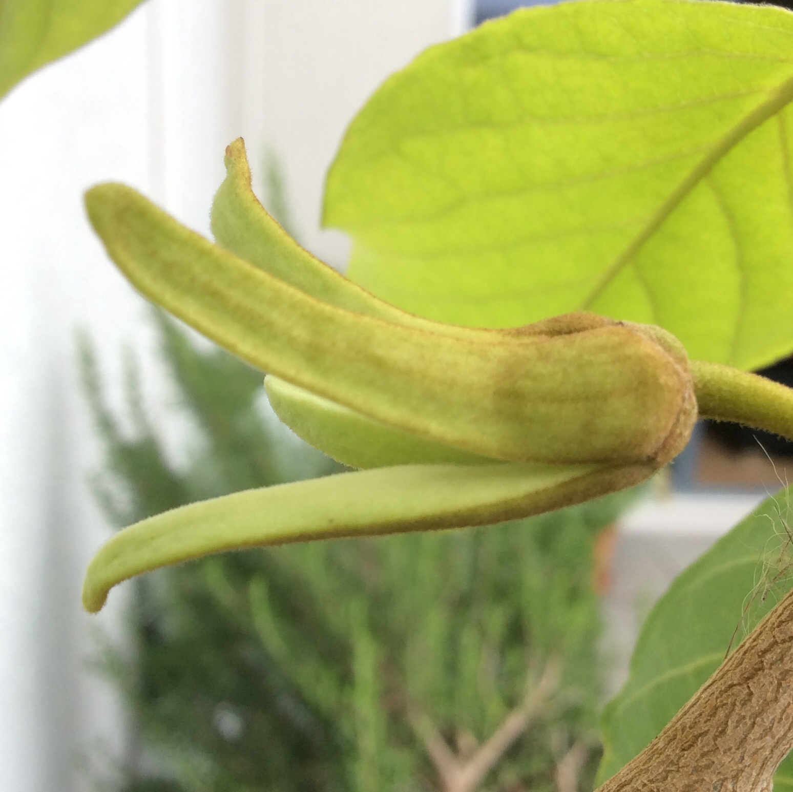 Die ganze Zeit schon überlege ich immer wieder, ob es sich bei dieser peruanischen Pflanze wirklich um eine normale Chirimoya handelt. Sie unterscheidet sich deutlich von den anderen drei, die spanischen Früchten entstammen: Die Blattform ist etwas anders, das Blattgrün heller, eher gelblich-grün, die Blätter weicher, etwas samtiger, der Wuchs etwas schwächer, zudem macht sie mir den Eindruck, dass sie lieber etwas höhere Temperaturen möchte, die Blütenknospen waren zu Beginn komplett mit dunklen Härchen überzogen (fällt mir gerade ein, das erinnerte etwas an jene von Asimina triloba), und auch jetzt sind da noch Härchen und die Farbe ist insgesamt bräunlicher/gelblicher, … Und jetzt das! Auch die zweite Blütenknospe scheint vier Blütenblätter zu haben. «Normal» ist diese Chiri also definitiv nicht.