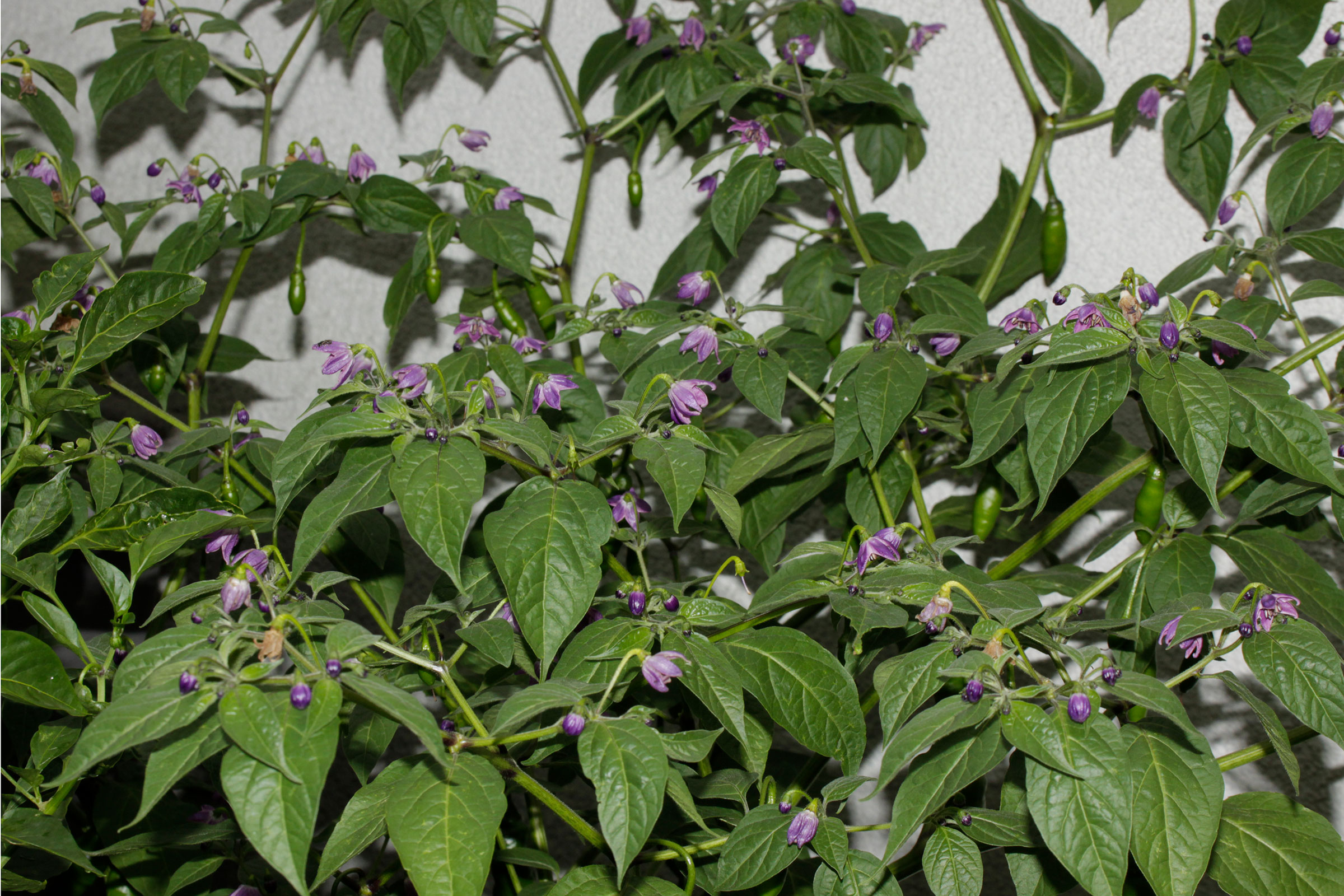 Und unter dem violetten Blütenmeer von Rocoto Ají largo, das bei kleinen Wildbienen beliebt zu sein scheint, hängen zahlreiche Früchtchen: