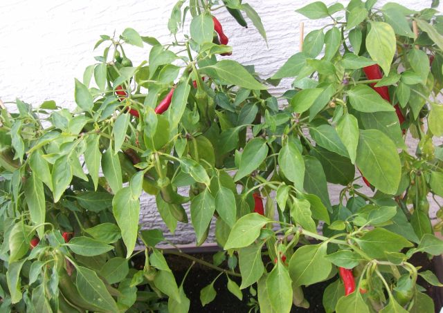 @Wollschweber: Geduld, Geduld, es wird. Die lassen sich halt ihre Zeit, aber unreif essen is ja bei den meisten auch nix. Meine reifen Cayenne und Habanero sind überwinterte, bis auf die Schoten, die man auf dem einen Balkon-Übersichtsbild sieht. Das ist eine Cayenne von diesem Jahr.