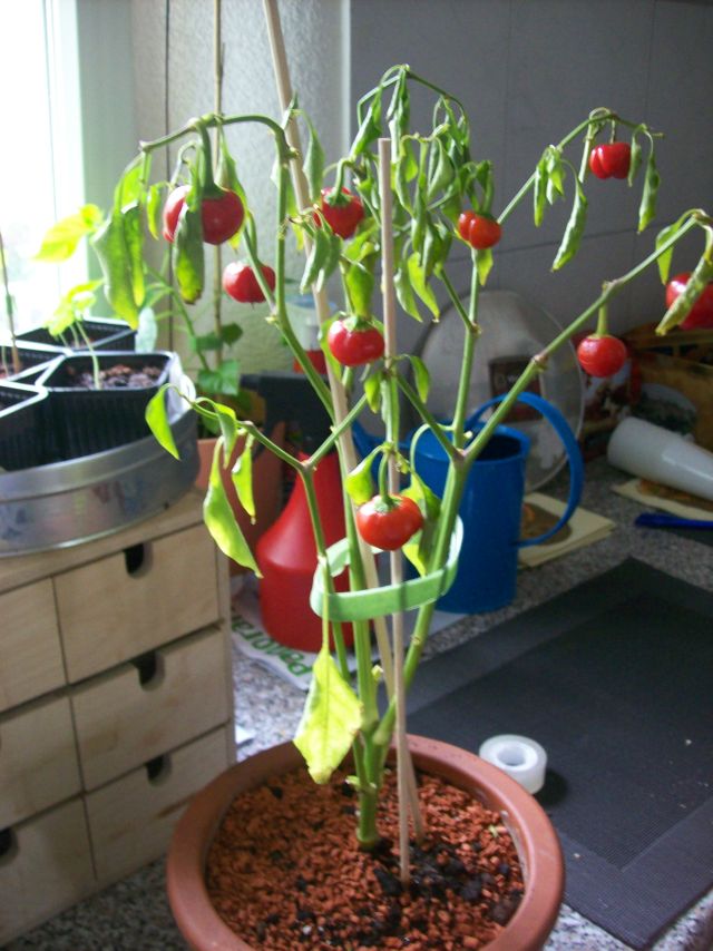 ich stell hier mal ein Bild von meiner neuen Tomaten-Chili ein – bei Ahrens & Sieberz bestellt, letzten Donnerstag ausgepackt (die Verpackung war miserabel...) und seitdem sieht sie so aus. Ich hatte gehofft, die hängenden Blätter liegen „nur“ am Licht- und Wassermangel, aber nachdem ich gegossen habe (Erde durchfeuchtet, aber keine Staunässe) und die Pflanze ans Fenster gestellt habe, hat sich nichts verbessert, im Gegenteil, es geht ihr immer schlechter. Der „Tipp“, den ich vom Lieferanten erhalten habe, war lapidar „gießen und gucken was passiert“. Da die „Erde“ aus einem einzigen Wurzelballen bestand, und die Pflanze keine richtige Erde mehr zur Verfügung hatte und auch total am Wackeln war, weil viel zu groß für ihren winzigen Topf, habe ich sie gestern in einen größeren Topf mit frischer Blumenerde, gemischt mit ein wenig Seramis, gesetzt. Ich dachte mir, mehr kaputt machen kann ich eh net. Außerdem habe ich alle reifen und alle winzigen Früchte abgeerntet und nur die größeren, aber noch nicht ganz reifen, drangelassen.