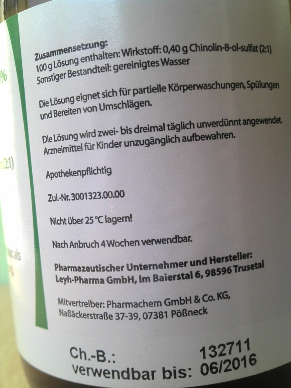 Nun, sie hatten nur NeoChinosol, welches ja einen anderen Wirkstoff hat. Die nette Dame meinte das man Chinosol nur auf Rezept bekommen könnte und hat mir nun "Solutio Hydroxychinoline 0,4% mit dem Wirkstoff Chinolin-8-ol-sulfat (2:1)" verkauft. Laut Wiki ist Chinolin-8-ol-sulfat das Gleiche wie 8-Hydroxychinolin.