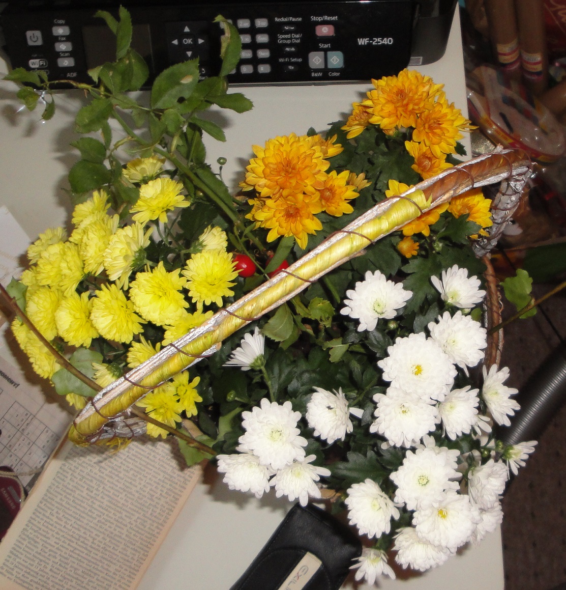Gestern habe ich ein bepflanztes Körbchen erhalten. Soweit ich weiß, handelt es sich hierbei um drei verschiedene Chrysanthemen, Hagebutte und einpaar Efeuzweige. Mit dem Efeu kenn ich mich bereits etwas aus. Dieser kann sicherlich auf dem Balkon überwintert werden.