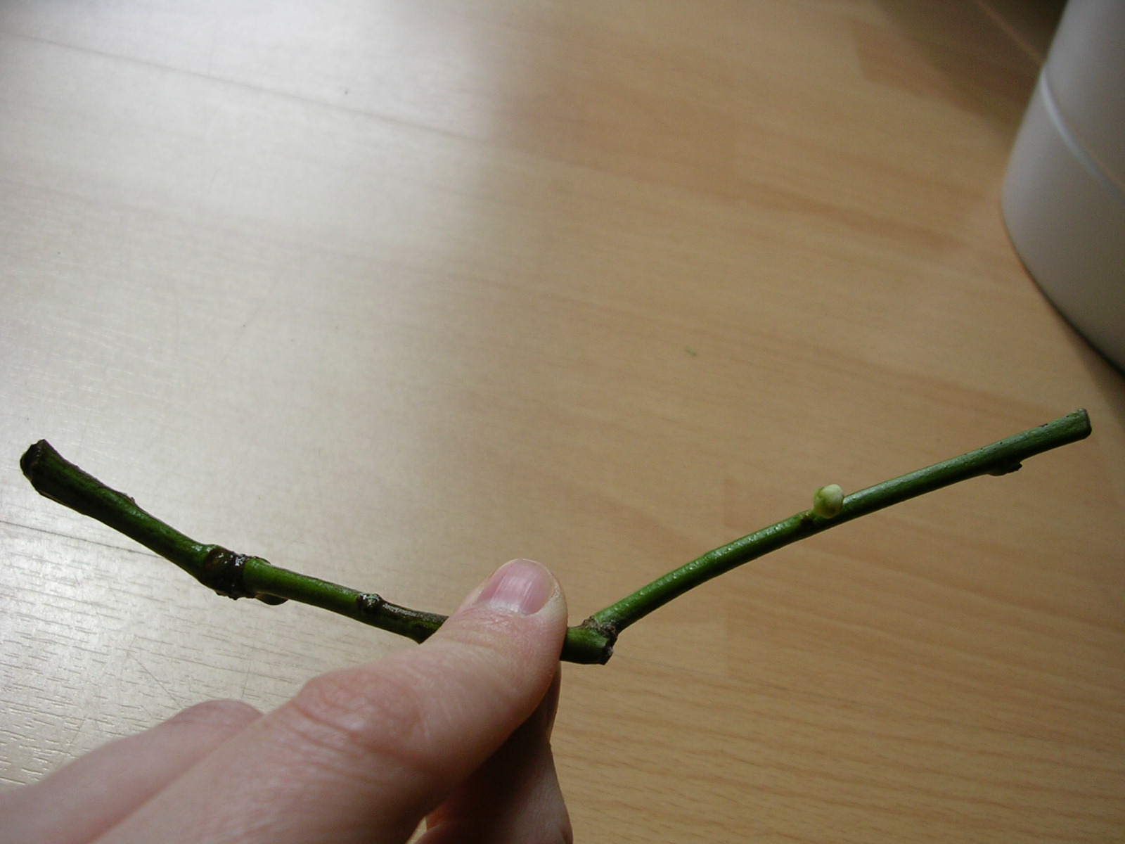 Er ist im Juli 2009 geschnitten worden. Ich hatte ihn zuerst, wie man es ja machen soll, in einem sandigen Substratgemisch, aber er faulte dauernd und dann kamen noch ständig die Trauermücken. Also dachte ich mir: im Wasser klappt das zwar nicht so gut, aber anders sehen die Chancen noch schlechter aus. Nun steht er also seit Ewigkeiten im Wasser, nach einem halben Jahr ist mir aus Versehen das Blatt abgebrochen, ich dachte schon mittlerweile er wäre tot. Und was macht der jetzt? Statt mal endlich zu wurzeln bringt der mir doch glatt ne Knospe!